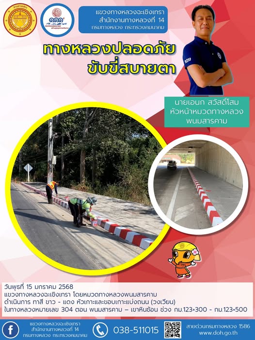 ทาสี ขาว - แดง หัวเกาะและขอบเกาะแบ่งถนน (วงเวียน) |