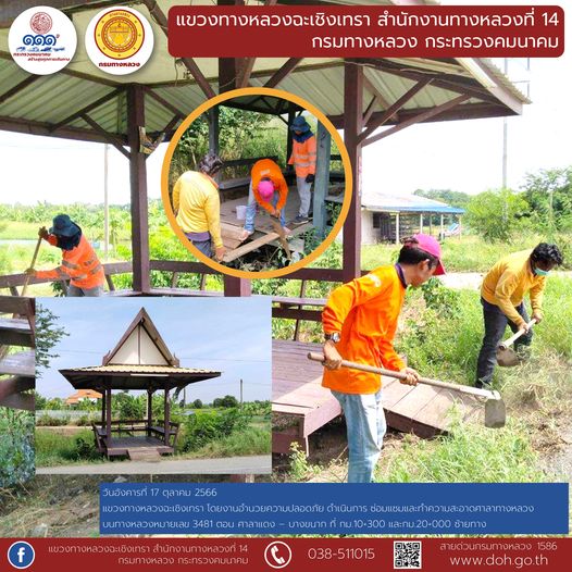 งานซ่อมแซมและทำความสะอาดศาลาทางหลวง ทล.3481 ตอน ศาลาแดง – บางขนาก กม.10+300 และ กม.20+000 ด้านซ้ายทาง โดยงานอำนวยความปลอดภัย