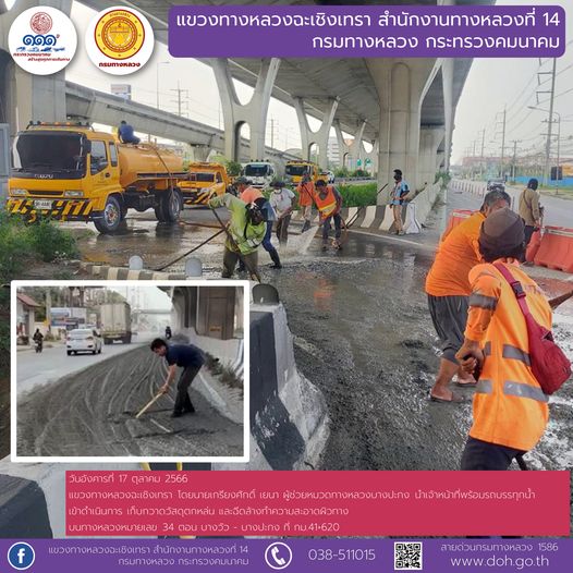 นายเกรียงศักดิ์ เยนา ผู้ช่วยหมวดทางหลวงบางปะกง นำเจ้าหน้าที่พร้อมรถบรรทุกน้ำ เข้าเก็บกวาดวัสดุตกหล่น และฉีดล้างทำความสะอาดผิวทาง บนทางหลวงหมายเลข 34 ตอน บางวัว - บางปะกง ที่ กม.41+620