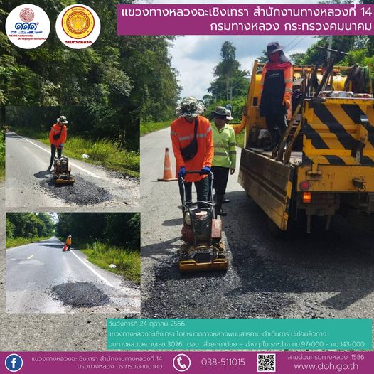 งานปะซ่อมผิวทาง ทล.3076 ตอน สี่แยกนาน้อย – อ่างฤาไน กม.97+000 - กม.143+000 โดยหมวดทางหลวงพนมสารคาม