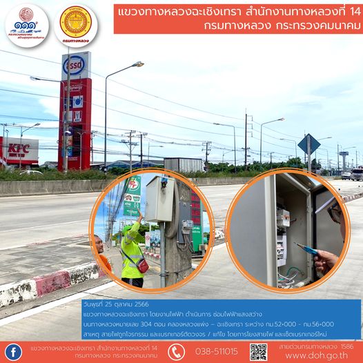 งานไฟฟ้า ซ่อมไฟฟ้าแสงสว่าง ทล.304 ตอน คลองหลวงแพ่ง – ฉะเชิงเทรา กม.52+000 - กม.56+000 จากสาเหตุสายไฟถูกโจรกรรม