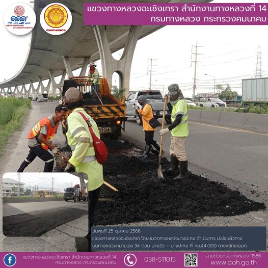 งานปะซ่อมผิวทาง บนทางหลวงหมายเลข 34 ถนนเทพรัตน โดยหมวดทางหลวงบางปะกง