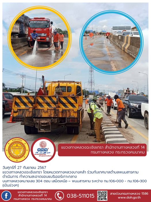 หมวดทางหลวงบางคล้า ร่วมกับเทศบาลตำบลพนมสารคาม (สนับสนุนรถน้ำ) ทำความสะอาดขอบแบริเออร์เกาะกลาง บน ทล.304 ตอน เสม็ดเหนือ – พนมสารคาม กม.106+000 - กม.106+300 (เป็นช่วงๆ)