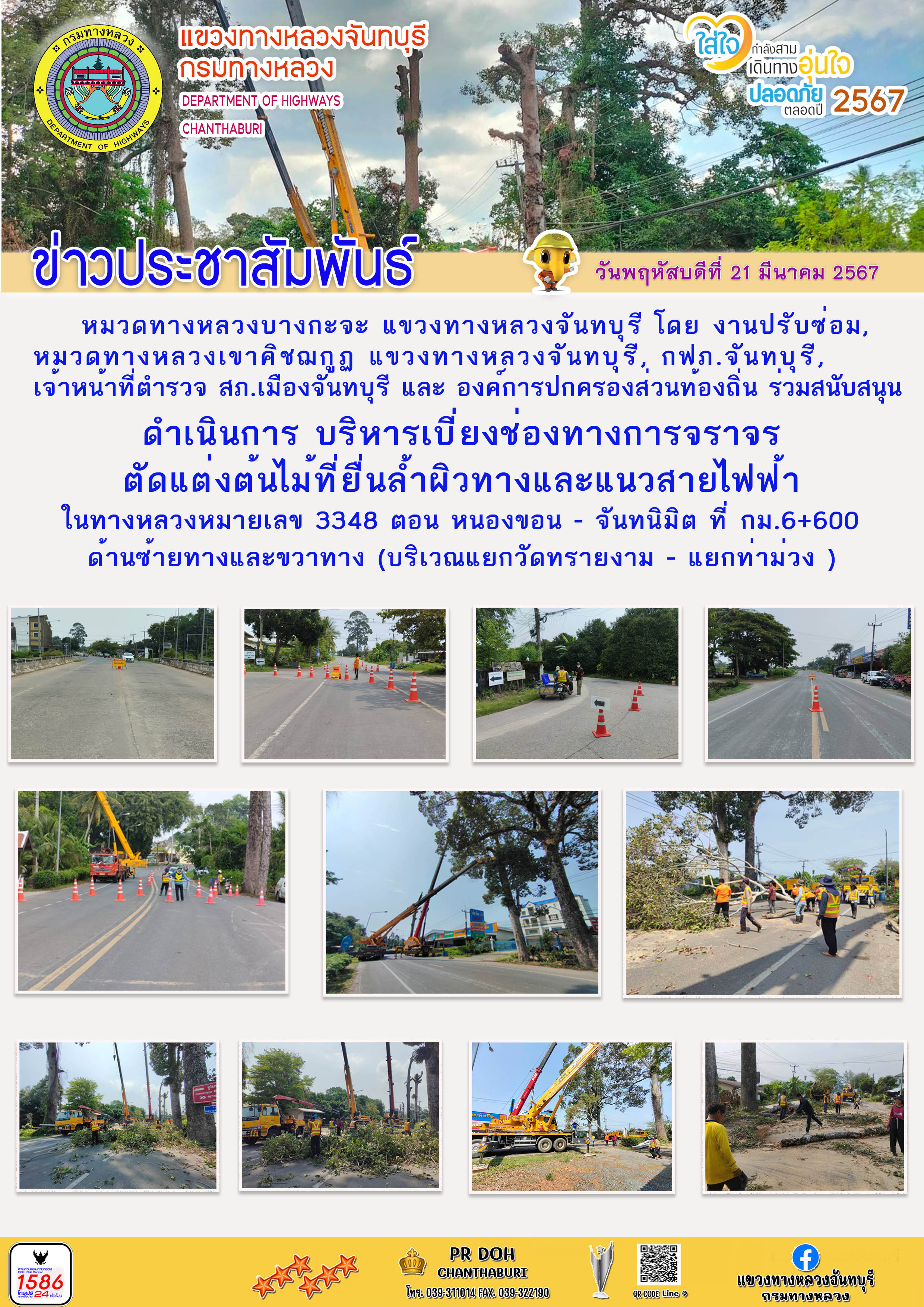 หมวดทางหลวงบางกะจะ ดำเนินการ บริหารเบี่ยงช่องทางการจราจร ตัดแต่งต้นไม้ที่ยื่นล้ำผิวทางและแนวสายไฟฟ้า ในทางหลวงหมายเลข 3348 ตอน หนองขอน - จันทนิมิต