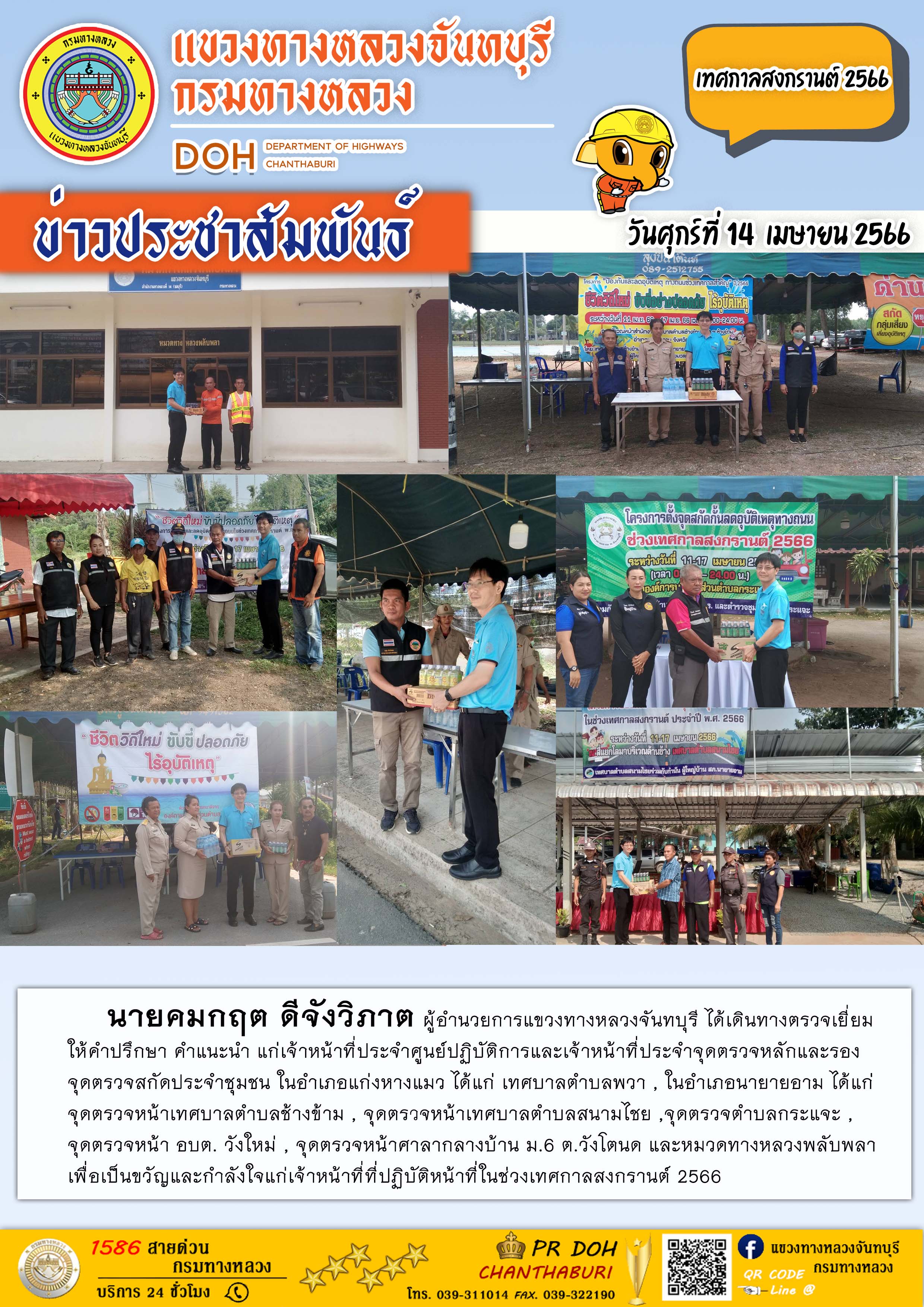 แขวงทางทางหลวงจันทบุรี และคณะ ได้ทำการต้อนรับ การตรวจติดตามการอำนวยความสะดวกฯ ช่วงเทศกาลสงกรานต์ 2566 ของนายชยธรรม์ พรหมศร ปลัดกระทรวงคมนาคม และ นายมนตรี เดชาสกุลสม ผู้ตรวจราชการกระทรวงคมนาคม