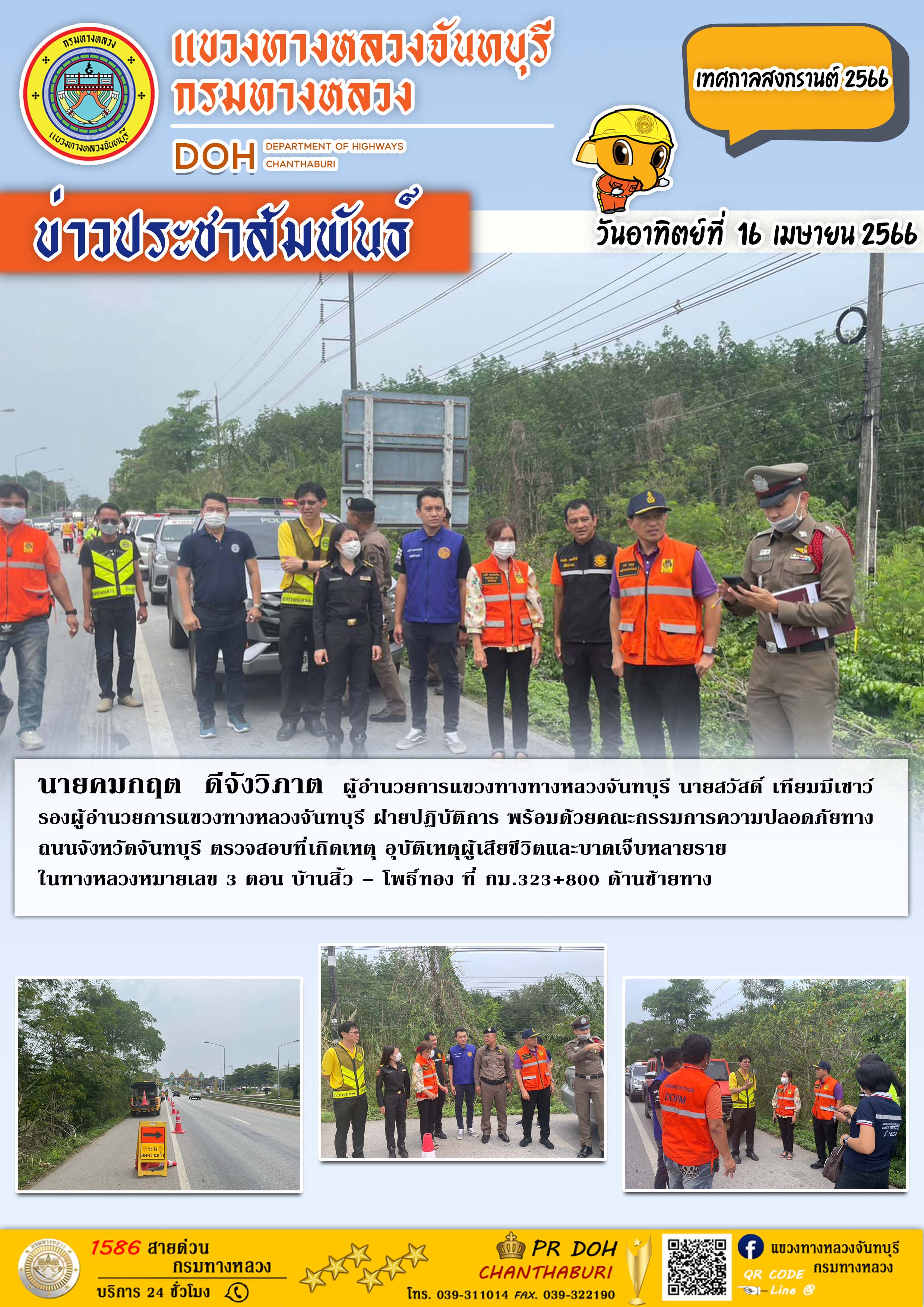 แขวงทางทางหลวงจันทบุรี แขวงทางทางหลวงจันทบุรี พร้อมด้วยคณะกรรมการความปลอดภัยทางถนนจังหวัดจันทบุรี ตรวจสอบที่เกิดเหตุ อุบัติเหตุผู้เสียชีวิตและบาดเจ็บหลายราย