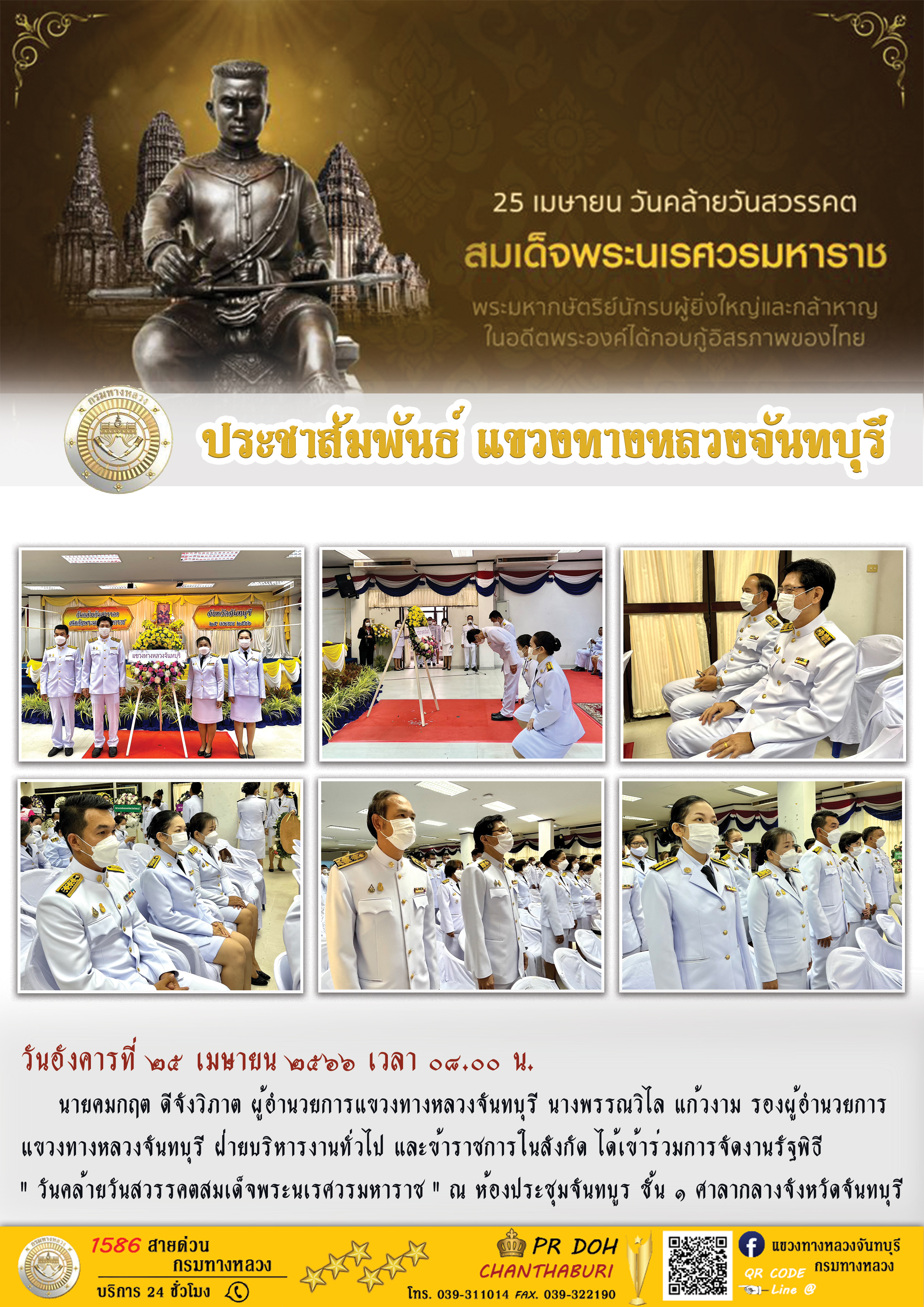 แขวงทางหลวงจันทบุรี ได้เข้าร่วมการจัดงานรัฐพิธี " วันคล้ายวันสวรรคตสมเด็จพระนเรศวรมหาราช "