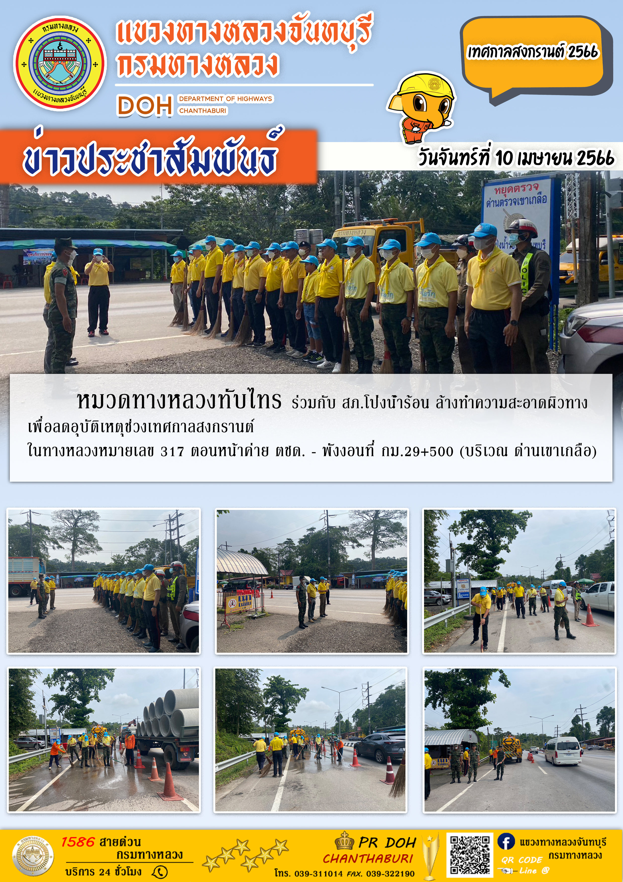 หมวดทางหลวงทับไทร ร่วมกับ สภ.โป่งน้ำร้อน ล้างทำความสะอาดผิวทางเพื่อลดอุบัติเหตุช่วงเทศกาลสงกรานต์