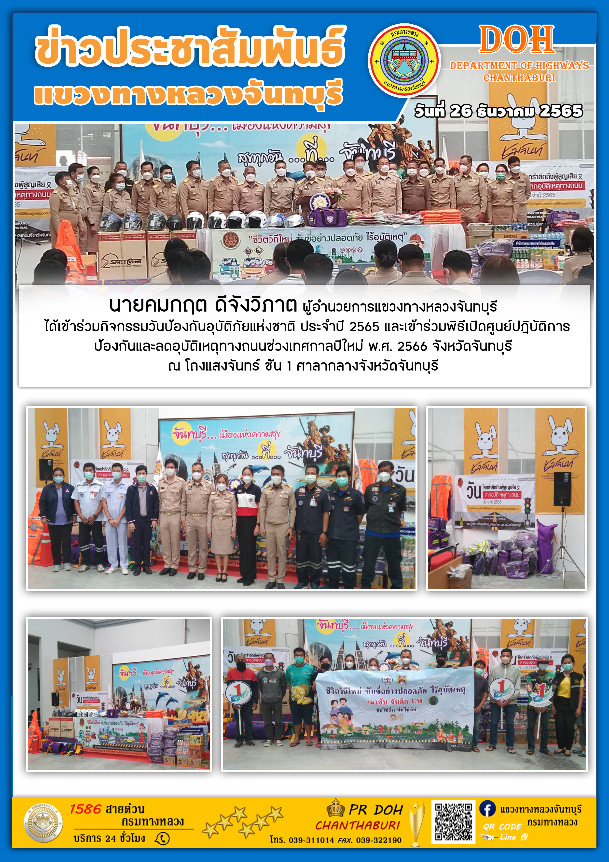 เข้าร่วมกิจกรรมวันป้องกันอุบัติภัยแห่งชาติ ประจำปี 2565 และเข้าร่วมพิธีเปิดศูนย์ปฏิบัติการป้องกันและลดอุบัติเหตุทางถนนช่วงเทศกาลปีใหม่ พ.ศ. 2566 จังหวัดจันทบุรี
