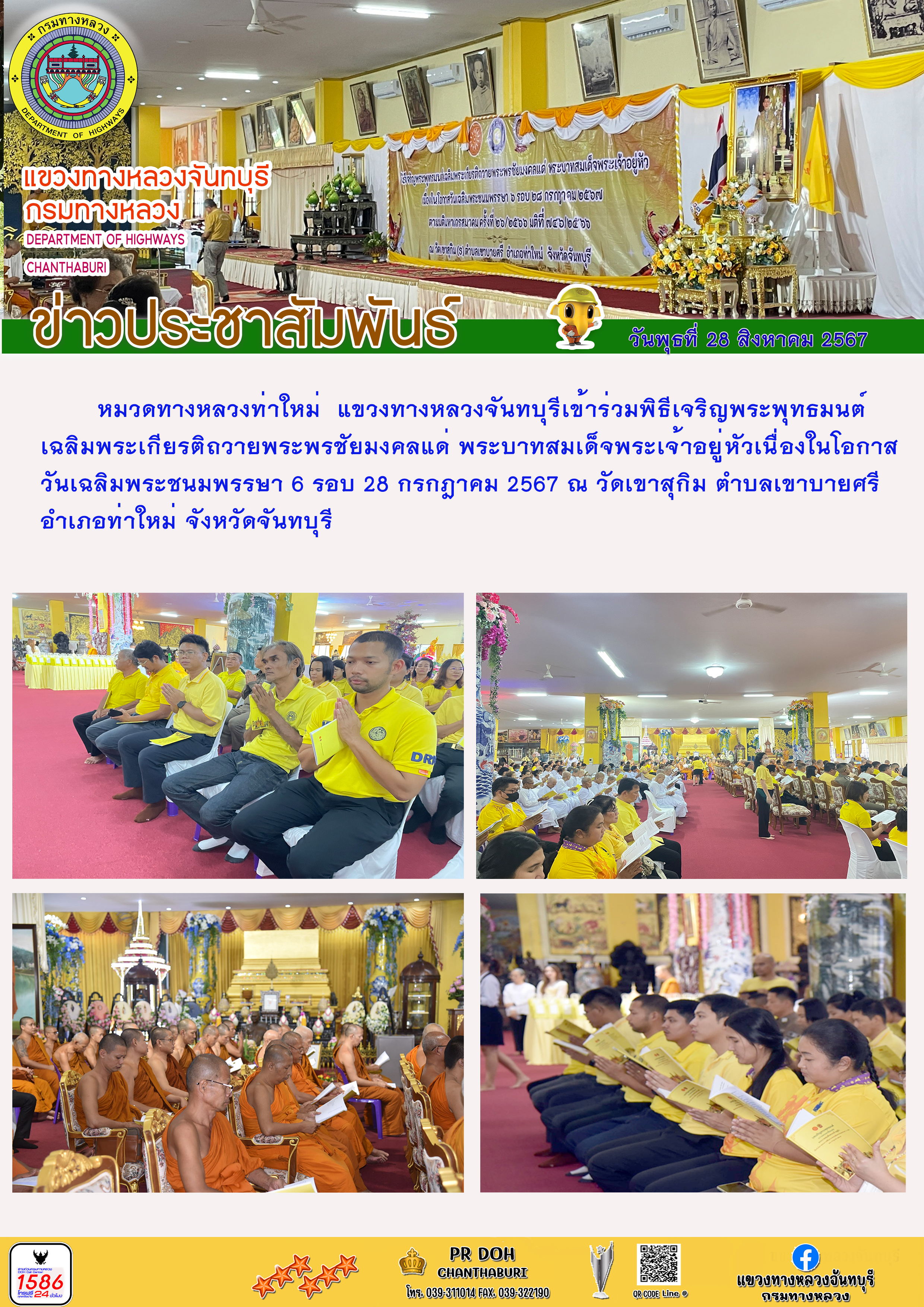 95 28/08/2567 หมวดทางหลวงท่าใหม่ แขวงทางหลวงจันทบุรี เข้าร่วมพิธีเจริญพระพุทธมนต์ เฉลิมพระเกียรติถวายพระพรชัยมงคลแด่ พระบาทสมเด็จพระเจ้าอยู่หัวเนื่องในโอกาสวันเฉลิมพระชนมพรรษา 6 รอบ 28 กรกฎาคม 2567