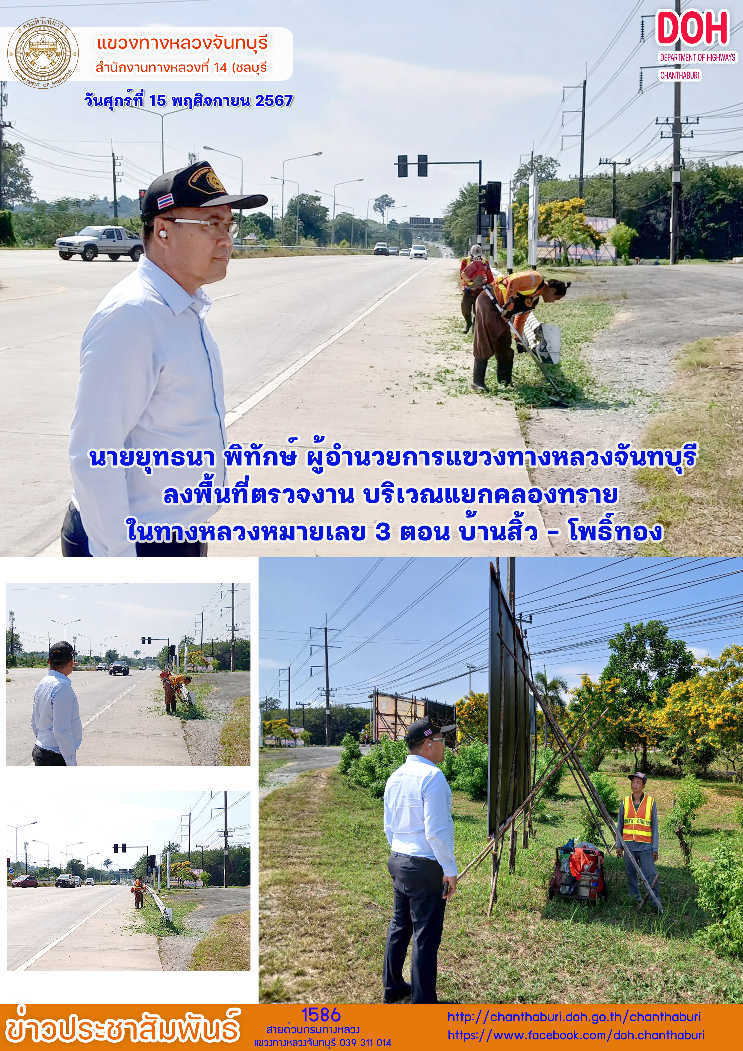 91 15/11/2567 แขวงทางหลวง ลงพื้นที่ตรวจการทำงาน บริเวณแยกคลองทราย ทางหลวงหมายเลข 3