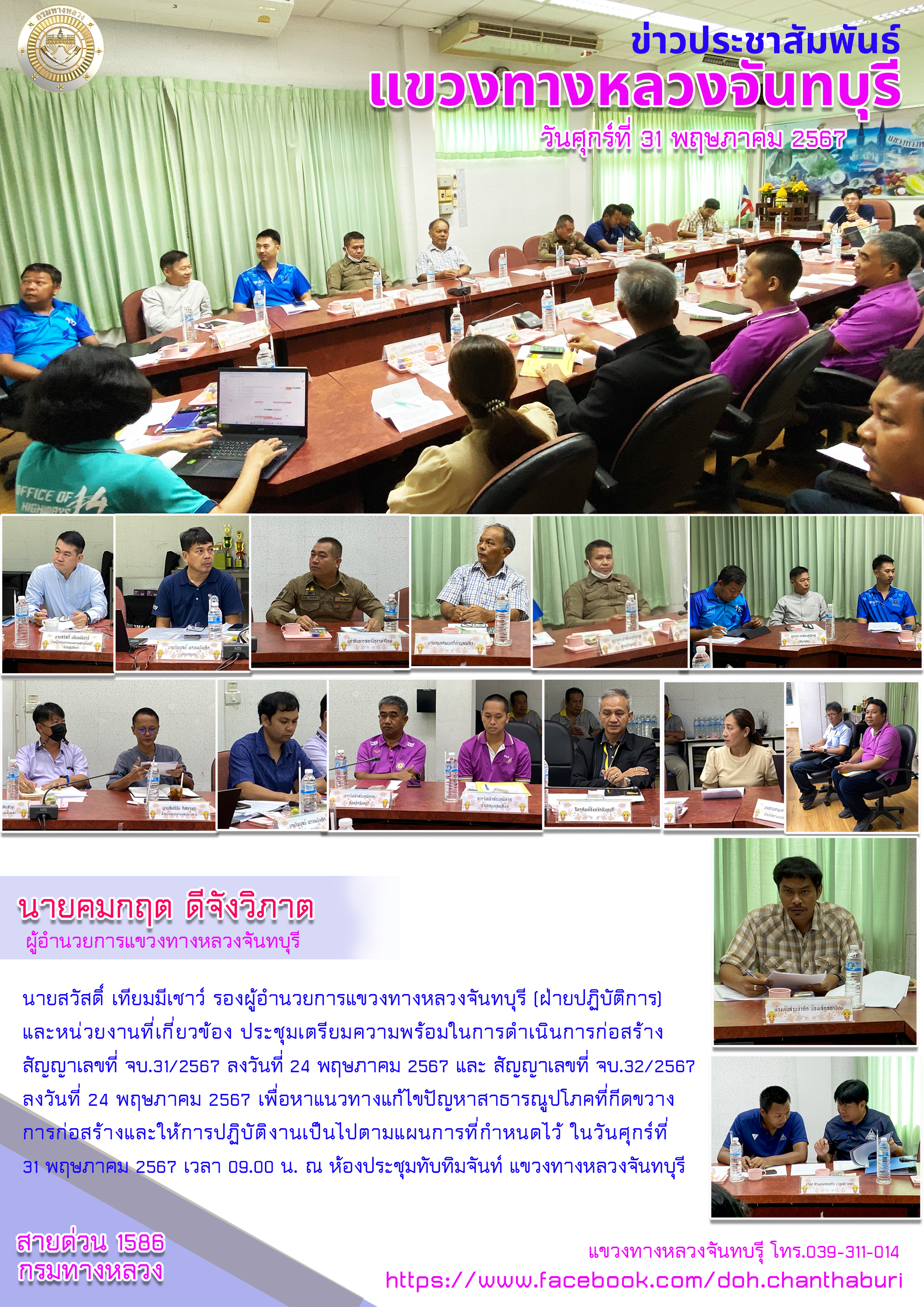 ในวันศุกร์ที่ 31 พฤษภาคม 2567 เวลา 09.00 น. ณ ห้องประชุมทับทิมจันท์ แขวงทางหลวงจันทบุรี