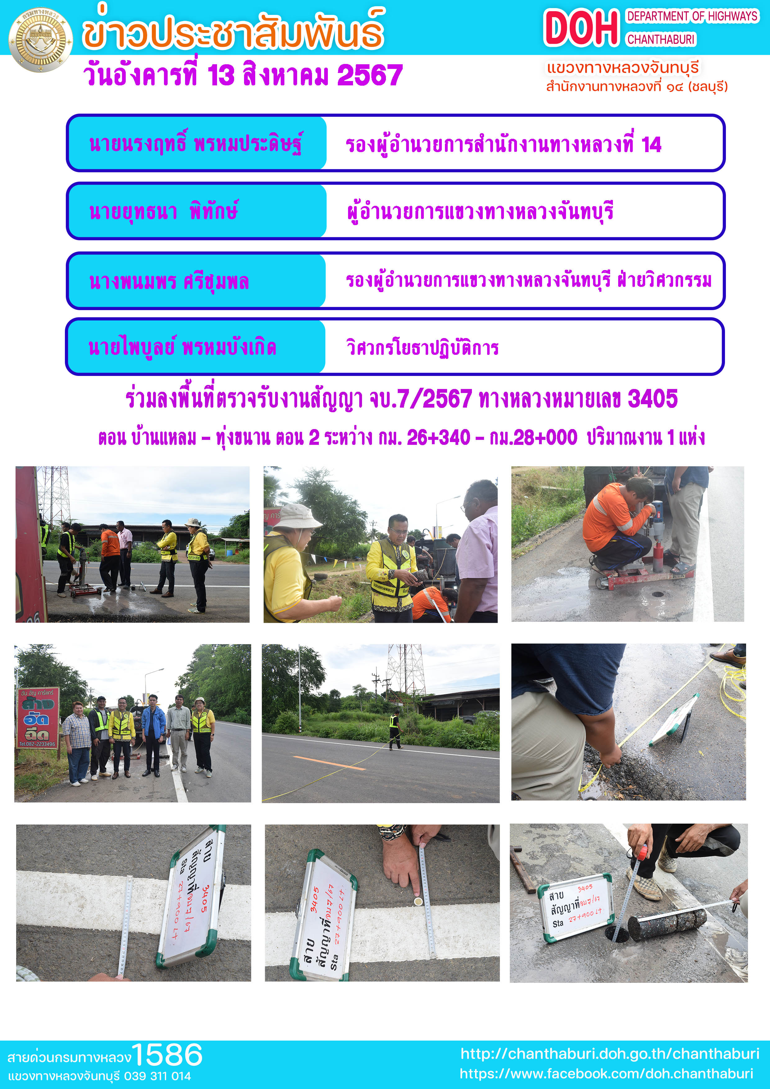 แขวงทางหลวงจันทบุรี ร่วมลงพื้นที่ตรวจรับงานสัญญา จบ.7/2567 ทางหลวงหมายเลข 3405 ตอน บ้านแหลม - ทุ่งขนาน