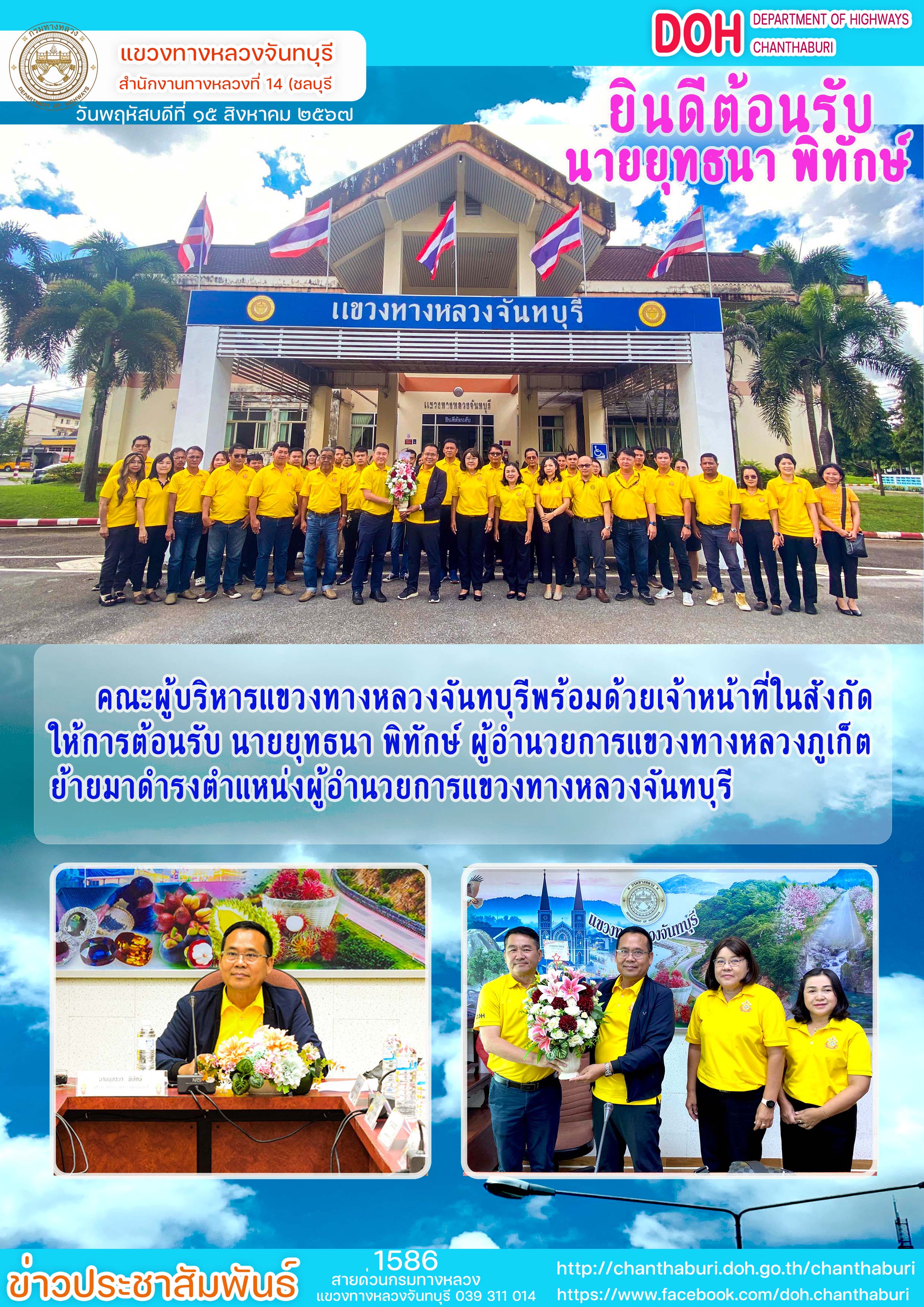 คณะผู้บริหารแขวงทางหลวงจันทบุรีพร้อมด้วยเจ้าหน้าที่ในสังกัดให้การต้อนรับ นายยุทธนา พิทักษ์ ผู้อำนวยการแขวงทางหลวงภูเก็ต ย้ายมาดำรงตำแหน่งผู้อำนวยการแขวงทางหลวงจันทบุรี