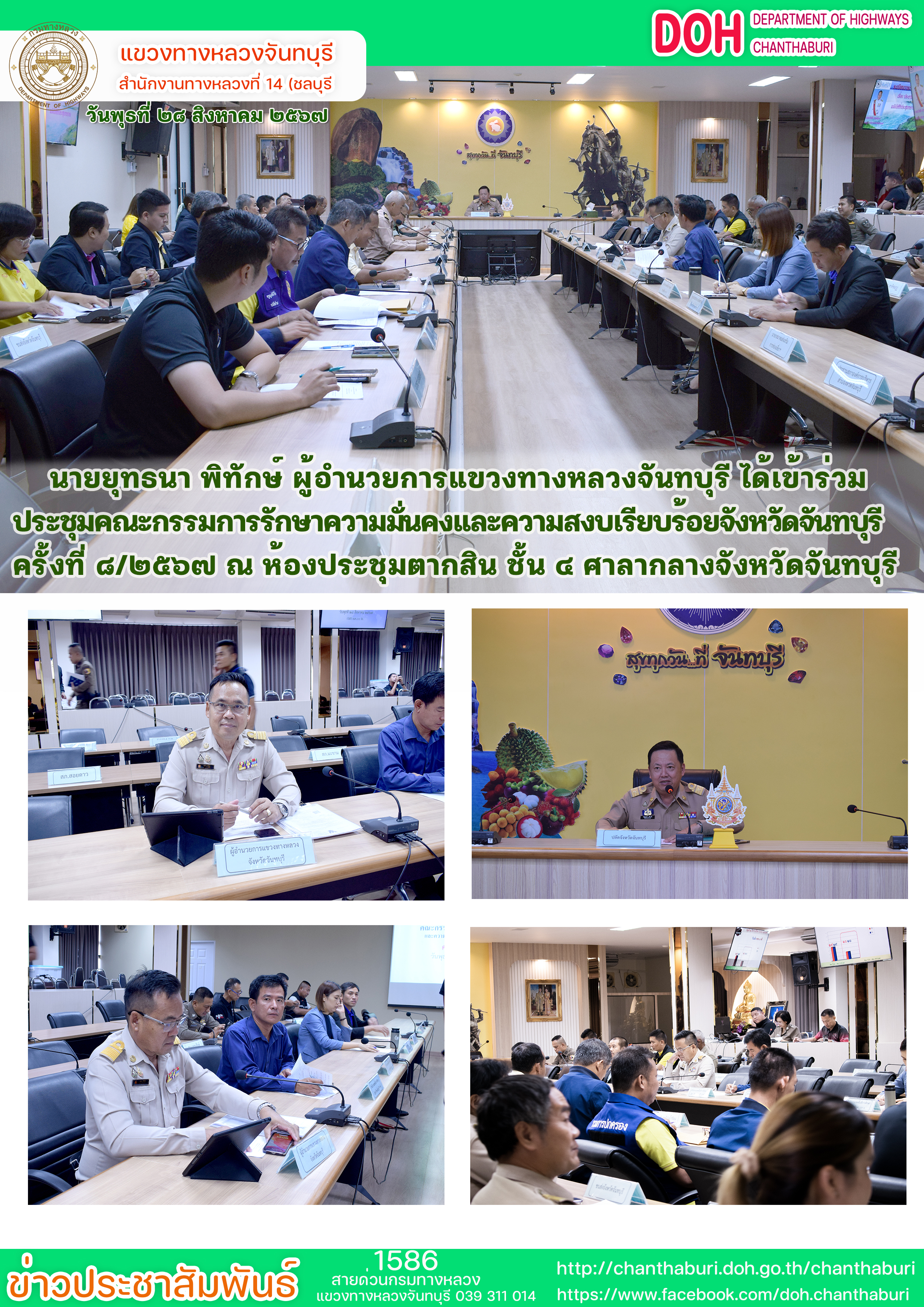 แขวงทางหลวงจันทบุรี ได้เข้าร่วมประชุมคณะกรรมการรักษาความมั่นคงและความสงบเรียบร้อยจังหวัดจันทบุรี ครั้งที่ ๘/๒๕๖๗