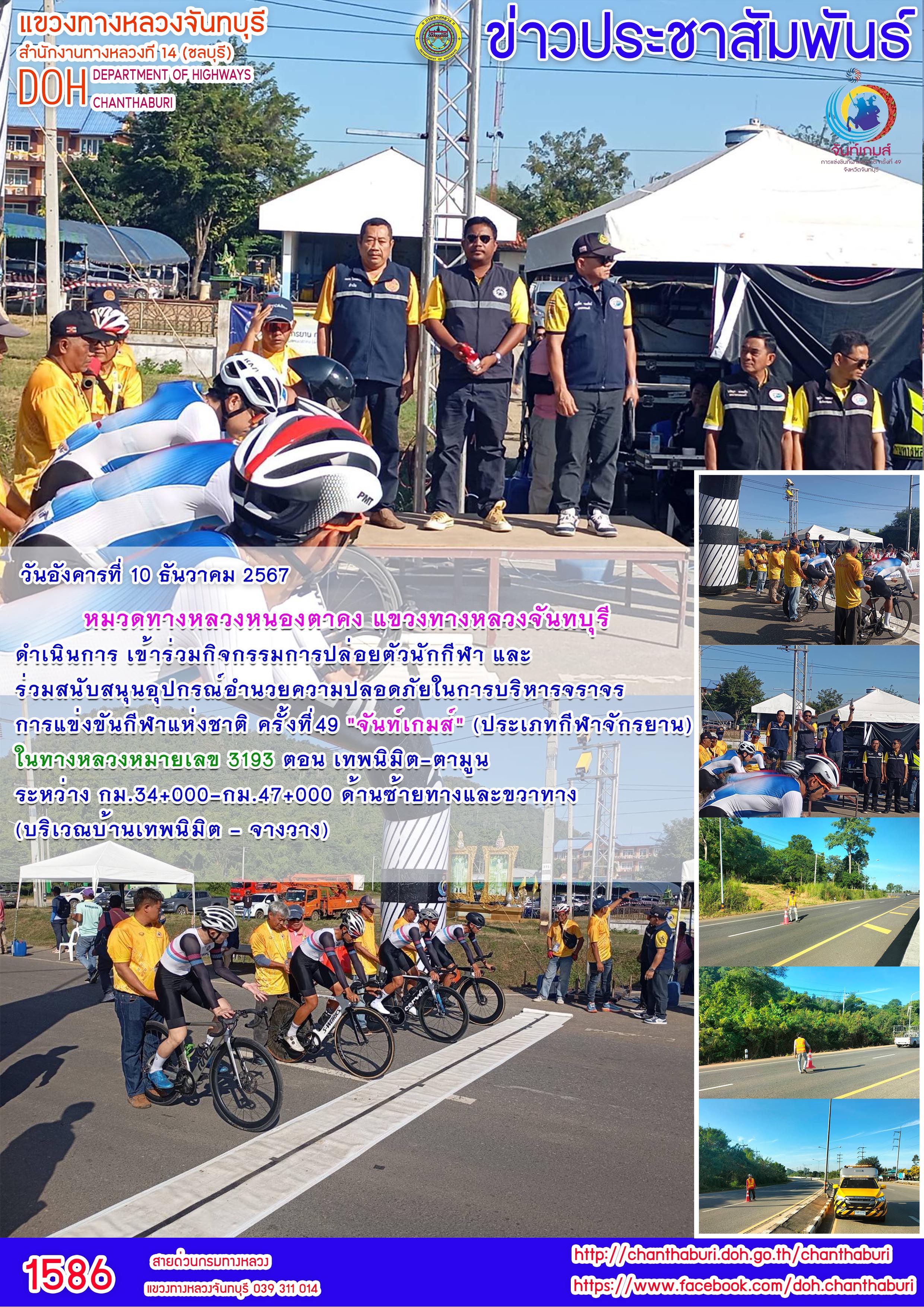หมวดทางหลวงหนองตาคง แขวงทางหลวงจันทบุรี ดำเนินการ เข้าร่วมกิจกรรมการปล่อยตัวนักกีฬา และร่วมสนับสนุนอุปกรณ์อำนวยความปลอดภัยในการบริหารจราจร การแข่งขันกีฬาแห่งชาติ ครั้งที่49 "จันท์เกมส์" (ประเภทกีฬาจักรยาน) ในทางหลวงหมายเลข 3193 ตอน เทพนิมิต-ตามูน ระหว่าง กม.34+000-กม.47+000 ด้านซ้ายทางและขวาทาง (บริเวณบ้านเทพนิมิต - จางวาง)
