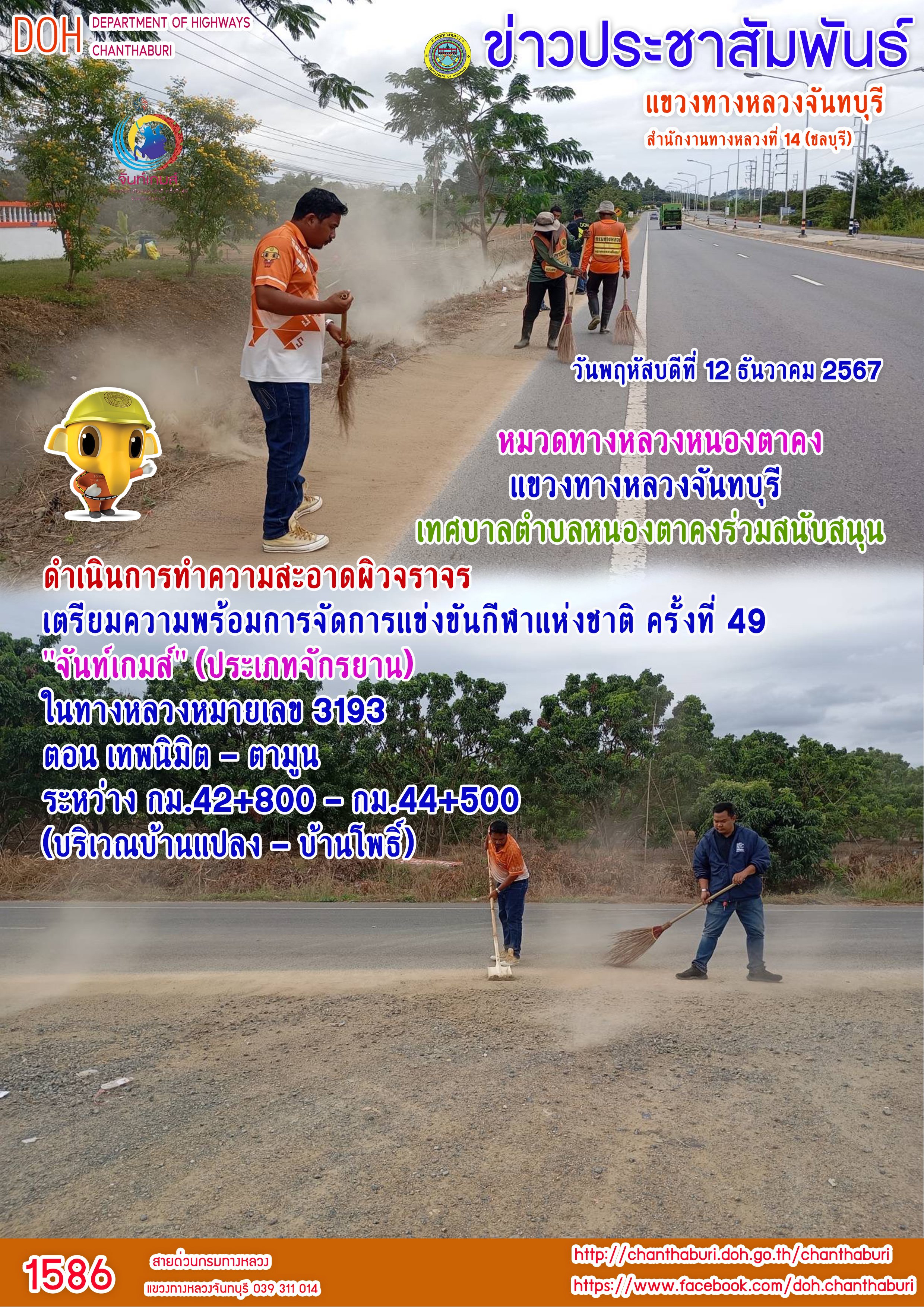ดำเนินการทำความสะอาดผิวจราจร เตรียมความพร้อมการจัดการแข่งขันกีฬาแห่งชาติ ครั้งที่ 49 "จันท์เกมส์" (ประเภทจักรยาน) ในทางหลวงหมายเลข 3193ตอน เทพนิมิต - ตามูนระหว่าง กม.42+800 - กม.44+500 (บริเวณบ้านแปลง - บ้านโพธิ์)