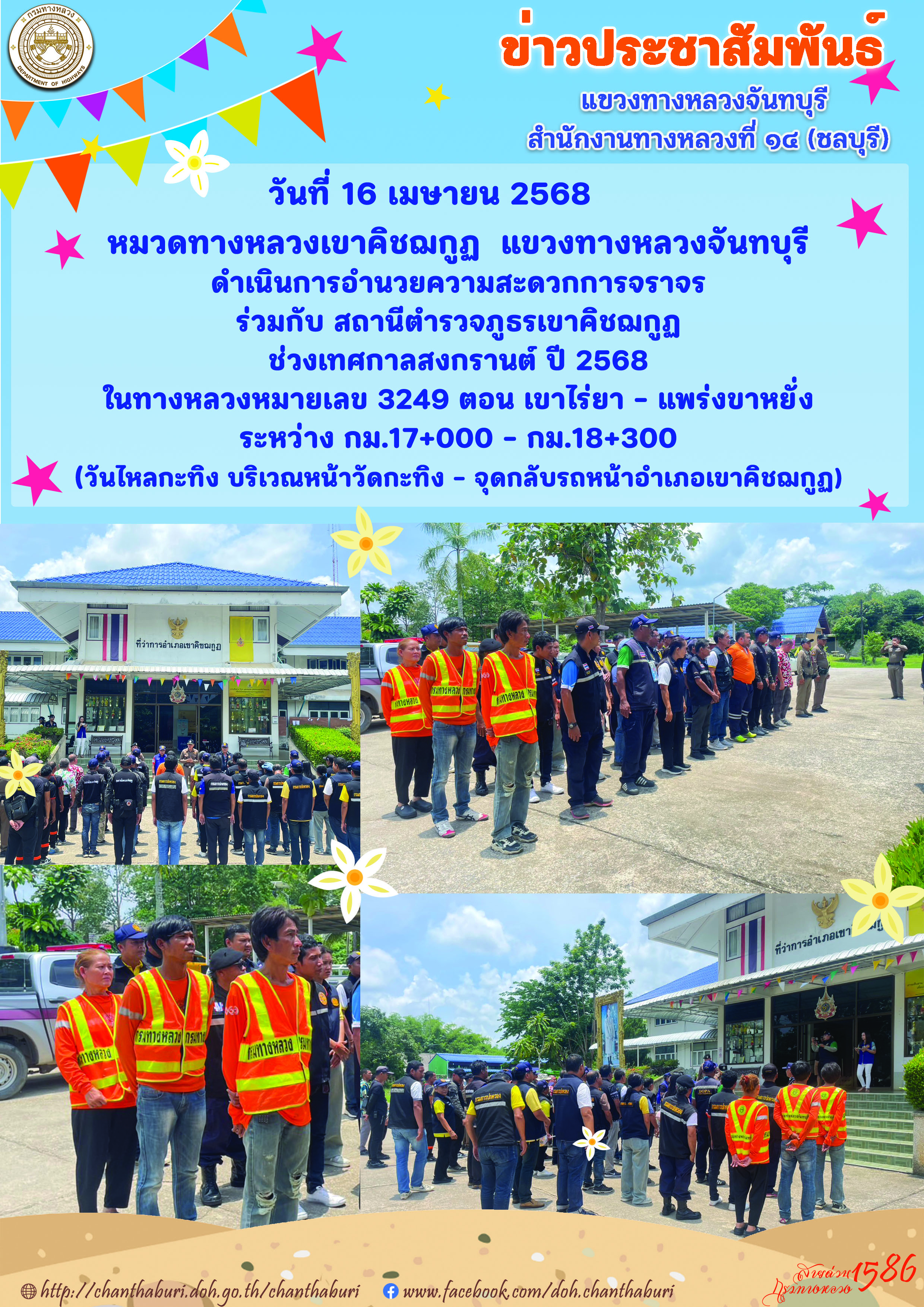 หมวดทางหลวงเขาคิชฌกูฏ แขวงทางหลวงจันทบุรีดำเนินการอำนวยความสะดวกการจราจร ร่วมกับ สถานีตำรวจภูธรเขาคิชฌกูฏ ช่วงเทศกาลสงกรานต์ ปี 2568 ในทางหลวงหมายเลข 3249 ตอน เขาไร่ยา - แพร่งขาหยั่ง ระหว่าง กม.17+000 - กม.18+300 (วันไหลกะทิง บริเวณหน้าวัดกะทิง - จุดกลับรถหน้าอำเภอเขาคิชฌกูฏ)