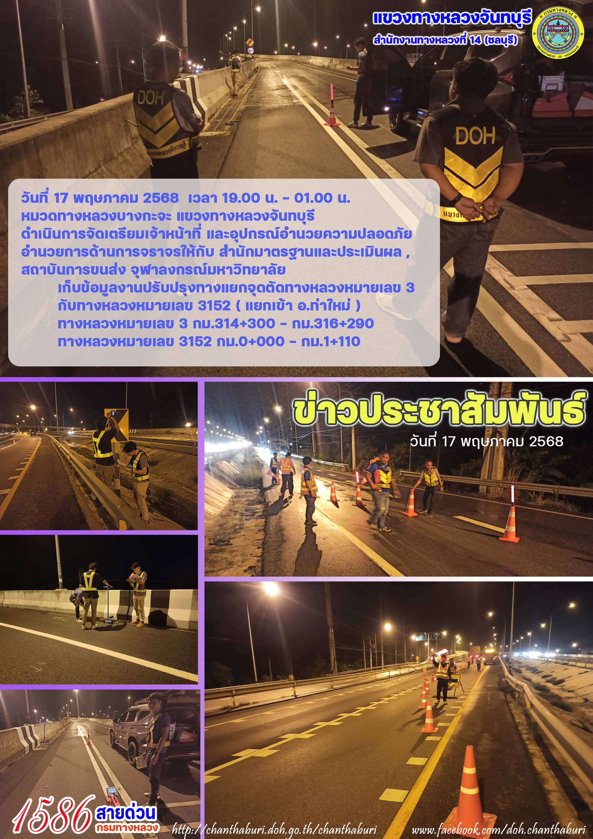 วันที่ 17 พฤษภาคม 2568 เวลา 19.00 น. - 01.00 น.หมวดทางหลวงบางกะจะ แขวงทางหลวงจันทบุรี ดำเนินการจัดเตรียมเจ้าหน้าที่ และอุปกรณ์อำนวยความปลอดภัย อำนวยการด้านการจราจรให้กับ สำนักมาตรฐานและประเมินผล , สถาบันการขนส่ง จุฬาลงกรณ์มหาวิทยาลัย เก็บข้อมูลงานปรับปรุงทางแยกจุดตัดทางหลวงหมายเลข 3 กับทางหลวงหมายเลข 3152 ( แยกเข้า อ.ท่าใหม่ ) ทางหลวงหมายเลข 3 กม.314+300 - กม.316+290 ทางหลวงหมายเลข 3152 กม.0+000 - กม.1+110
