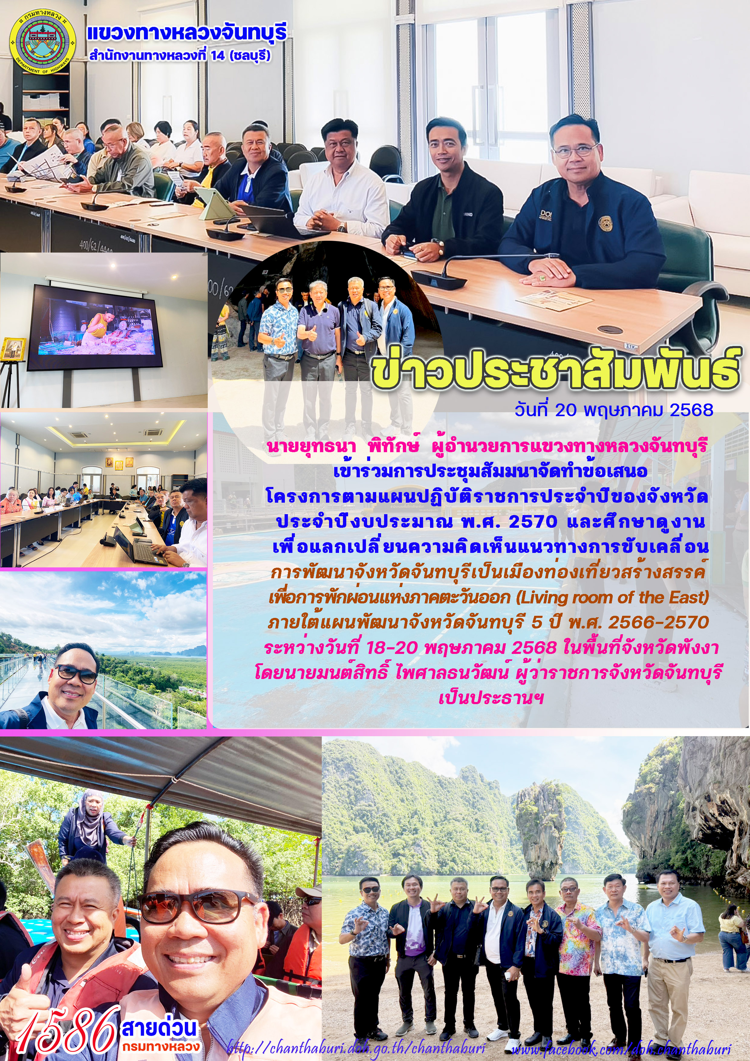 นายยุทธนา พิทักษ์ ผู้อำนวยการแขวงทางหลวงจันทบุรี เข้าร่วมการประชุมสัมมนาจัดทำข้อเสนอโครงการตามแผนปฏิบัติราชการประจำปีของจังหวัด ประจำปีงบประมาณ พ.ศ. 2570 และศึกษาดูงานเพื่อแลกเปลี่ยนความคิดเห็นแนวทางการขับเคลื่อนการพัฒนาจังหวัดจันทบุรีเป็นเมืองท่องเที่ยวสร้างสรรค์ เพื่อการพักผ่อนแห่งภาคตะวันออก (Living room of the East) ภายใต้แผนพัฒนาจังหวัดจันทบุรี 5 ปี พ.ศ. 2566-2570 ระหว่างวันที่ 18-20 พฤษภาคม 2568 ในพื้นที่จังหวัดพังงาโดยนายมนต์สิทธิ์ ไพศาลธนวัฒน์ ผู้ว่าราชการจังหวัดจันทบุรี เป็นประธานฯ