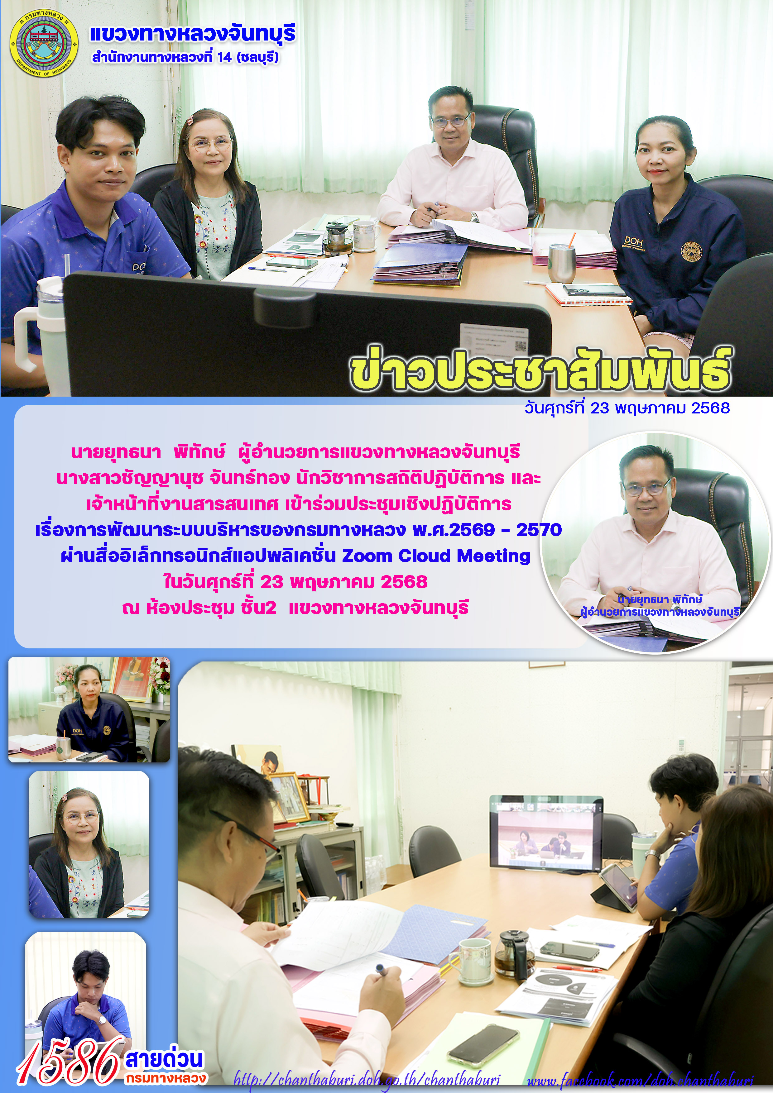 นายยุทธนา พิทักษ์ ผู้อำนวยการแขวงทางหลวงจันทบุรี นางสาวชัญญานุช จันทร์ทอง นักวิชาการสถิติปฏิบัติการ และเจ้าหน้าที่งานสารสนเทศ เข้าร่วมประชุมเชิงปฏิบัติการเรื่องการพัฒนาระบบบริหารของกรมทางหลวง พ.ศ.2569 - 2570 ผ่านสื่ออิเล็กทรอนิกส์แอปพลิเคชั่น Zoom Cloud Meeting ในวันศุกร์ที่ 23 พฤษภาคม 2568 ณ ห้องประชุม ชั้น2 แขวงทางหลวงจันทบุรี