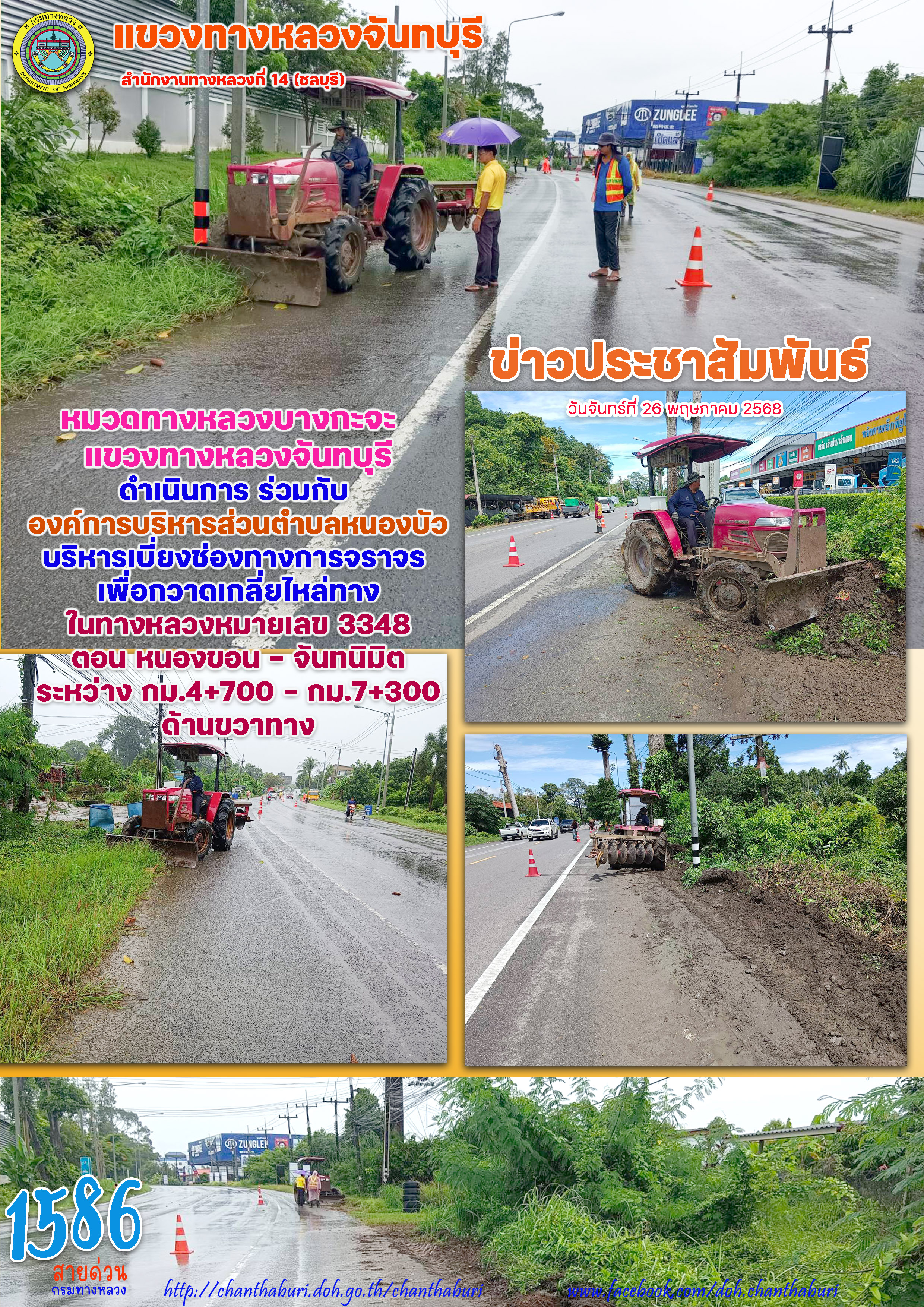 หมวดทางหลวงบางกะจะ แขวงทางหลวงจันทบุรี ดำเนินการ ร่วมกับ องค์การบริหารส่วนตำบลหนองบัวบริหารเบี่ยงช่องทางการจราจร เพื่อกวาดเกลี่ยไหล่ทางในทางหลวงหมายเลข 3348ตอน หนองขอน - จันทนิมิต ระหว่าง กม.4+700 - กม.7+300 ด้านขวาทาง