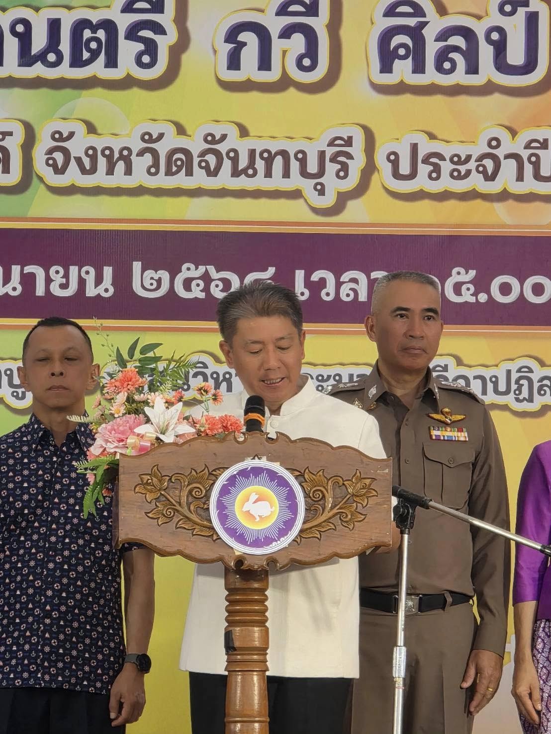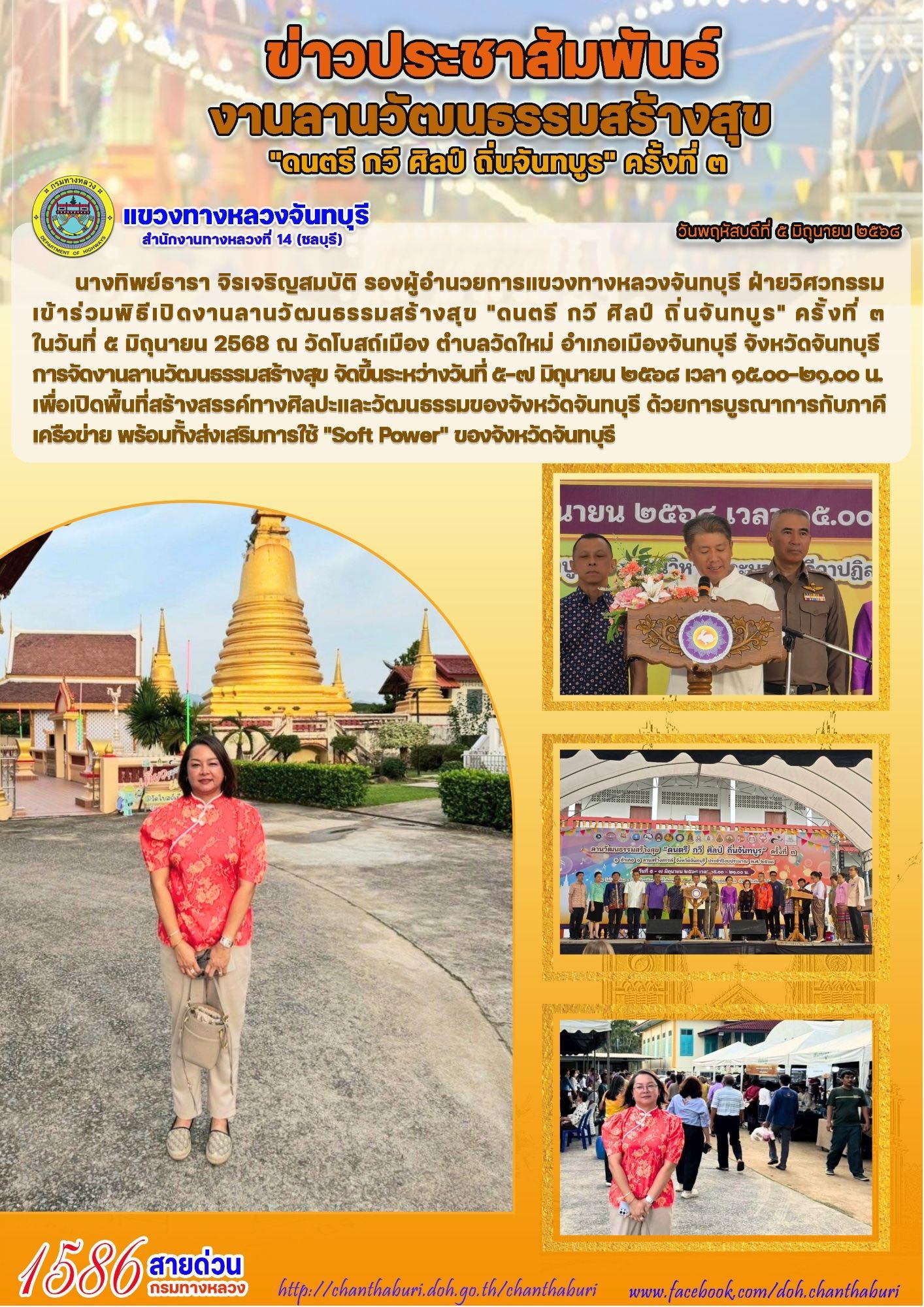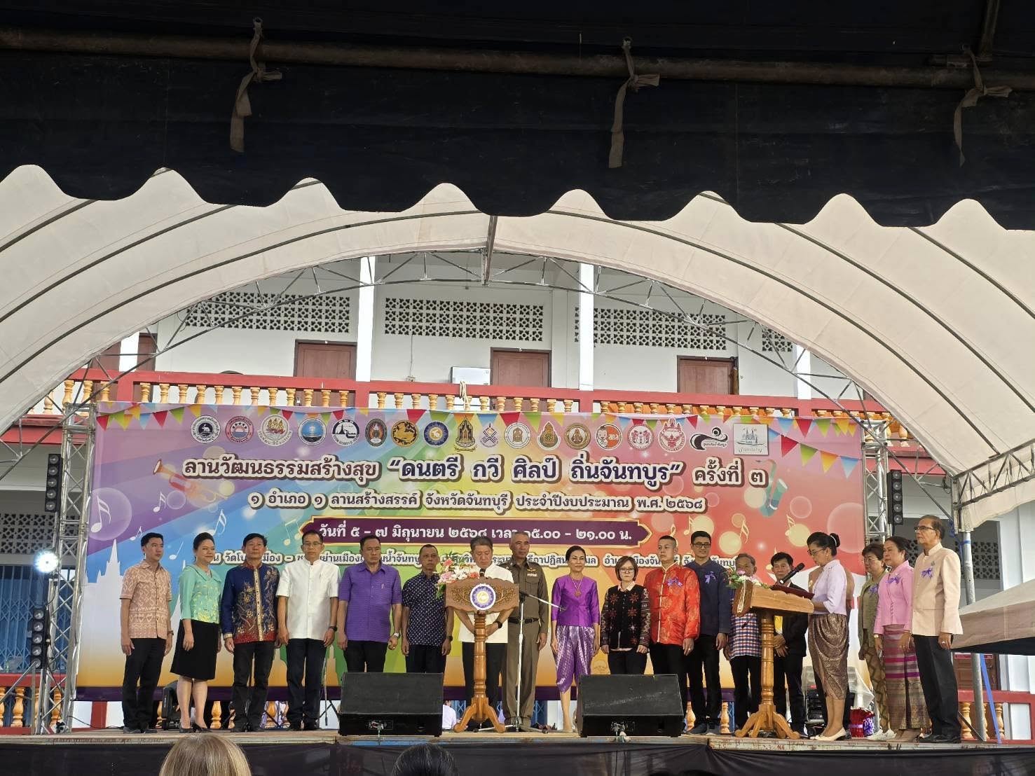 เข้าร่วมพิธิเปิดงานลานวัฒนธรรมสร้างสุข “ดนตรี กวี ศิลป์ ถิ่นจันทบูร” ครั้งที่ 3 ในวันที่ 5 มิถุนายน 2568 ณ วัดโบสถ์เมือง ตำบลวัดใหม่ อำเภอเมืองจันทบุรี จังหวัดจันทบุรี การจัดงานลานวัฒนธรรมสร้างสุข จัดขึ้นระหว่างวันที่ 5-7 มิถุนายน 2568 เวลา 15.00 – 21.00 น. เพื่อเปิดพื้นที่สร้างสรรค์ทางศิลปวัฒนธรรมของจังหวัดจันทบุรี ด้วยการบูรณาการกับภาคีเครือข่าย พร้อมทั้งส่งเสริมการใช้ “Soft Power” ของจังหวัดจันทบุรี