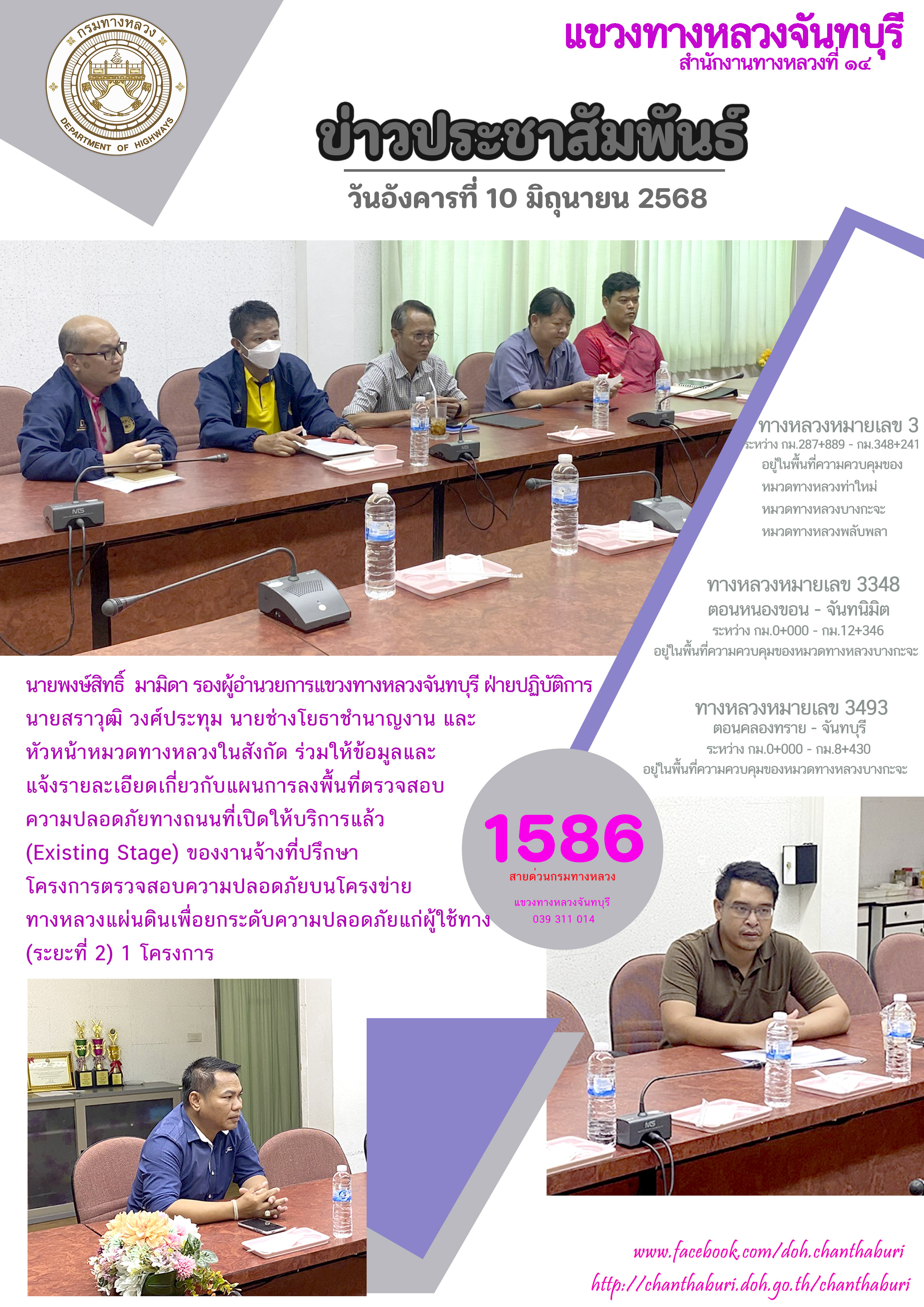 แขวงทางหลวงจันทบุรี ร่วมให้ข้อมูลและแจ้งรายละเอียดเกี่ยวกับแผนการลงพื้นที่ตรวจสอบความปลอดภัยทางถนนที่เปิดให้บริการแล้ว (Existing Stage) ของงานจ้างที่ปรึกษา โครงการตรวจสอบความปลอดภัยบนโครงข่ายทางหลวงแผ่นดินเพื่อยกระดับความปลอดภัยแก่ผู้ใช้ทาง (ระยะที่ 2) 1 โครงการ