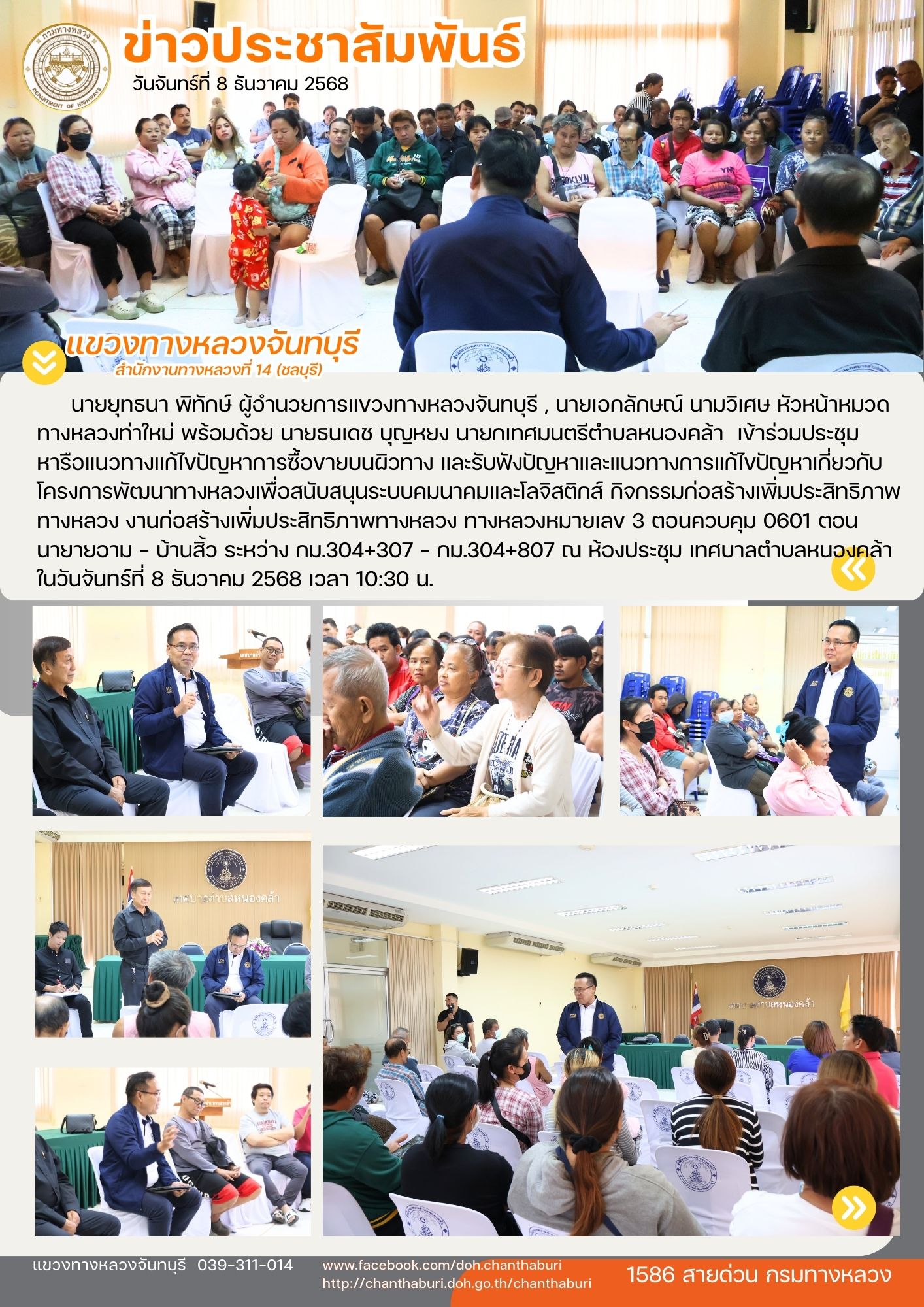 นายยุทธนา พิทักษ์ ผู้อำนวยการแขวงทางหลวงจันทบุรี , นายเอกลักษณ์ นามวิเศษ หัวหน้าหมวดทางหลวงท่าใหม่ พร้อมด้วย นายธนเดช บุญหยง นายกเทศมนตรีตำบลหนองคล้า เข้าร่วมประชุมหารือแนวทางแก้ไขปัญหาการซื้อขายบนผิวทาง และรับฟังปัญหาและแนวทางการแก้ไขปัญหาเกี่ยวกับโครงการพัฒนาทางหลวงเพื่อสนับสนุนระบบคมนาคมและโลจิสติกส์ กิจกรรมก่อสร้างเพิ่มประสิทธิภาพทางหลวง งานก่อสร้างเพิ่มประสิทธิภาพทางหลวง ทางหลวงหมายเลข 3 ตอนควบคุม 0601 ตอน นายายอาม - บ้านสิ้ว ระหว่าง กม.304+307 - กม.304+807 ณ ห้องประชุม เทศบาลตำบลหนองคล้า ในวันจันทร์ที่ 8 ธันวาคม 2568 เวลา 10:30 น.
