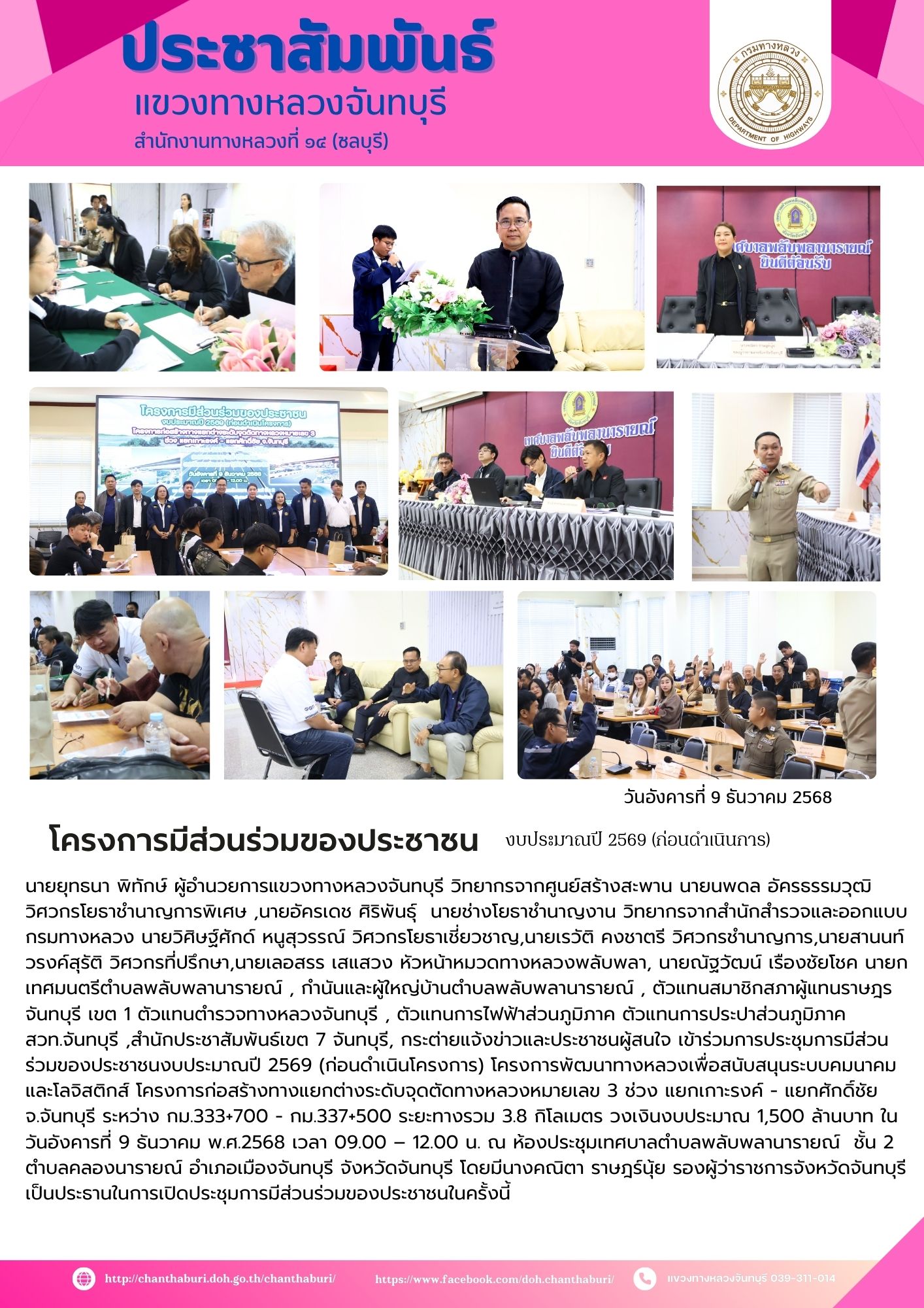 นายยุทธนา พิทักษ์ ผู้อำนวยการแขวงทางหลวงจันทบุรี วิทยากรจากศูนย์สร้างสะพาน นายนพดล อัครธรรมวุฒิ วิศวกรโยธาชำนาญการพิเศษ ,นายอัครเดช ศิริพันธุ์ นายช่างโยธาชำนาญงาน วิทยากรจากสำนักสำรวจและออกแบบ กรมทางหลวง นายวิศิษฐ์ศักด์ หนูสุวรรณ์ วิศวกรโยธาเชี่ยวชาญ,นายเรวัติ คงชาตรี วิศวกรชำนาญการ,นายสานนท์ วรงค์สุรัติ วิศวกรที่ปรึกษา,นายเลอสรร เสแสวง หัวหน้าหมวดทางหลวงพลับพลา, นายณัฐวัฒน์ เรืองชัยโชค นายกเทศมนตรีตำบลพลับพลานารายณ์ , กำนันและผู้ใหญ่บ้านตำบลพลับพลานารายณ์ , ตัวแทนสมาชิกสภาผู้แทนราษฎรจันทบุรี เขต 1 ตัวแทนตำรวจทางหลวงจันทบุรี , ตัวแทนการไฟฟ้าส่วนภูมิภาค ตัวแทนการประปาส่วนภูมิภาค สวท.จันทบุรี ,สำนักประชาสัมพันธ์เขต 7 จันทบุรี, กระต่ายแจ้งข่าวและประชาชนผู้สนใจ เข้าร่วมการประชุมการมีส่วนร่วมของประชาชนงบประมาณปี 2569 (ก่อนดำเนินโครงการ) โครงการพัฒนาทางหลวงเพื่อสนับสนุนระบบคมนาคมและโลจิสติกส์ โครงการก่อสร้างทางแยกต่างระดับจุดตัดทางหลวงหมายเลข 3 ช่วง แยกเกาะรงค์ - แยกศักดิ์ชัย จ.จันทบุรี ระหว่าง กม.333+700 - กม.337+500 ระยะทางรวม 3.8 กิโลเมตร วงเงินงบประมาณ 1,500 ล้านบาท ในวันอังคารที่ 9 ธันวาคม พ.ศ.2568 เวลา 09.00 – 12.00 น. ณ ห้องประชุมเทศบาลตำบลพลับพลานารายณ์ ชั้น 2 ตำบลคลองนารายณ์ อำเภอเมืองจันทบุรี จังหวัดจันทบุรี โดยมีนางคณิตา ราษฎร์นุ้ย รองผู้ว่าราชการจังหวัดจันทบุรี เป็นประธานในการเปิดประชุมการมีส่วนร่วมของประชาชนในครั้งนี้