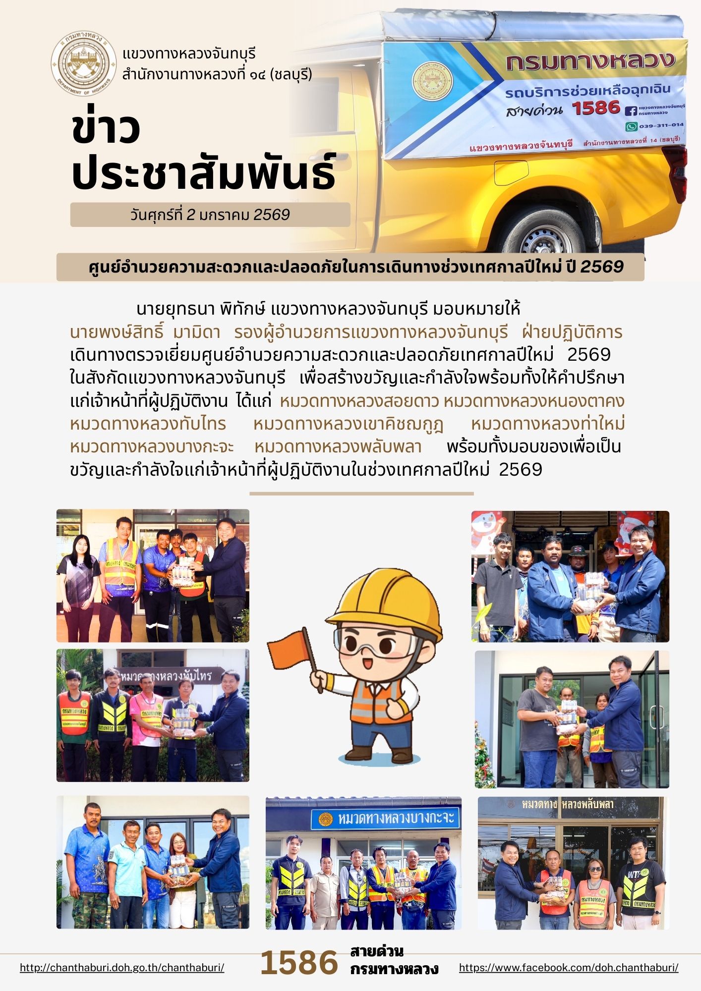 นายยุทธนา พิทักษ์ แขวงทางหลวงจันทบุรี มอบหมายให้ นายพงษ์สิทธิ์ มามิดา รองผู้อำนวยการแขวงทางหลวงจันทบุรี ฝ่ายปฏิบัติการ เดินทางตรวจเยี่ยมศูนย์อำนวยความสะดวกและปลอดภัยเทศกาลปีใหม่ 2569 ในสังกัดแขวงทางหลวงจันทบุรี เพื่อสร้างขวัญและกำลังใจพร้อมทั้งให้คำปรึกษา แก่เจ้าหน้าที่ผู้ปฏิบัติงาน ได้แก่ หมวดทางหลวงสอยดาว หมวดทางหลวงหนองตาคง หมวดทางหลวงทับไทร หมวดทางหลวงเขาคิชฌกูฎ หมวดทางหลวงท่าใหม่ หมวดทางหลวงบางกะจะ หมวดทางหลวงพลับพลา พร้อมทั้งมอบของเพื่อเป็นขวัญและกำลังใจแก่เจ้าหน้าที่ผู้ปฏิบัติงานในช่วงเทศกาลปีใหม่ 2569