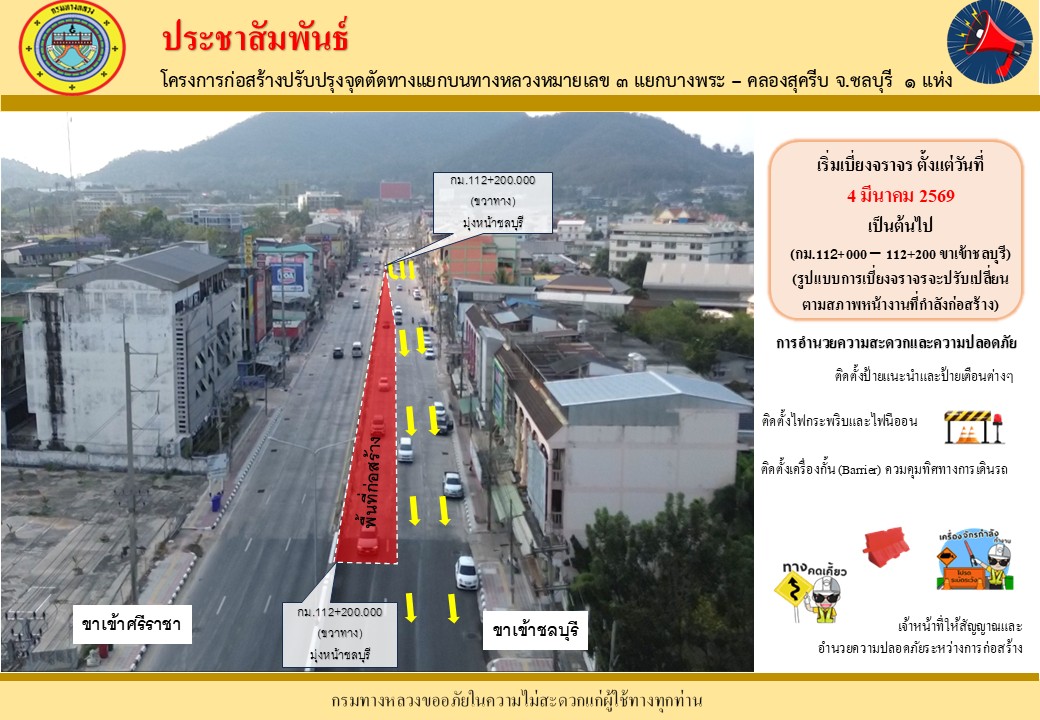 ก่อสร้างปรับปรุงจุดตัดทางแยกบนทางหลวงหมายเลข 3 ตอนแยกบางพระ - คลองสุครีบ การเบี่ยงการจราจร บริเวณ กม.112+000 - กม.112+200 (ขาเข้าชลบุรี)
