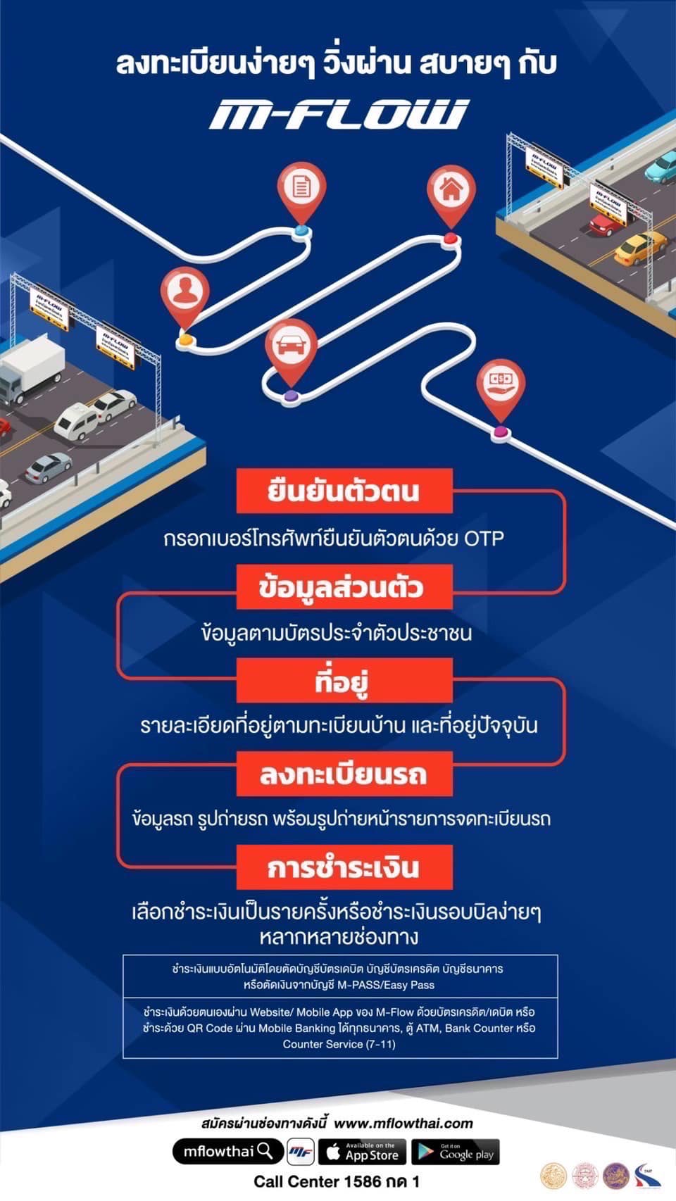 หรือป้ายทะเบียนไม่ชัดเจนไม่สามารถใช้บริการ M-Flow ได้ แต่ยังคงใช้ช่องชําระเงินสด และช่อง M-Pass Easy Pass ได้ หากสงสัยหรือต้องการสอบถามข้อมูลเพิ่มเติม โทรติดต่อได้ที่ Call Center โทร 1586 กด 1