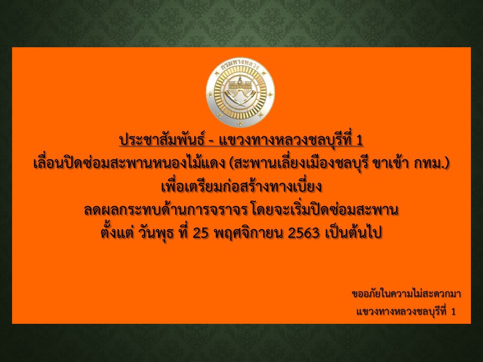 ข้อมูลข่าว : ประกาศขอเลื่อนปิดสะพานต่างระดับหนองไม้แดง บนทางหลวงหมายเลข 361 ทางเลี่ยงเมืองชลบุรี