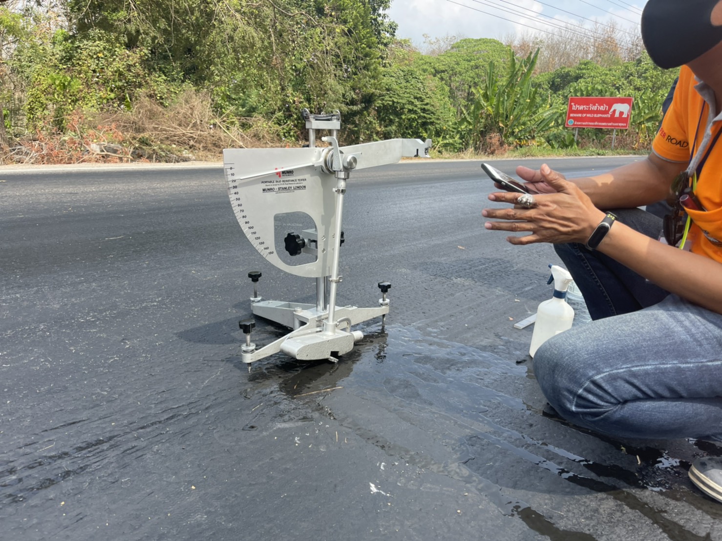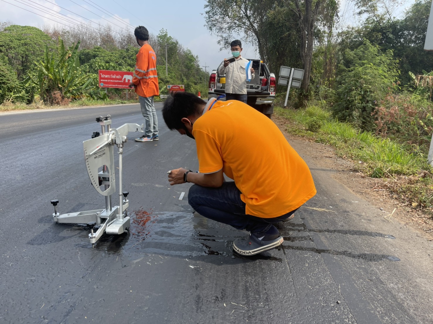 ร่วมกันทดสอบวัดผลค่าความลื่นของผิวถนน บนทางหลวงหมายเลข 3245 ตอน หนองเสือช้าง - หนองเสือช่อ ระหว่าง กม. 46+000 - กม. 47+000