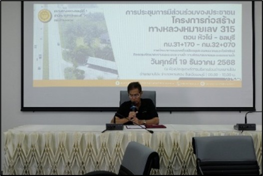 ชื่อโครงการ: สรุปผลการดำเนินงานการมีส่วนร่วมของประชาชน การพัฒนาทางหลวงเพื่อสนับสนุนระบบคมนาคมและโลจิสติกส์ กิจกรรมพัฒนาสะพานและระบบระบายน้ำ งานพัฒนาสะพานและระบบระบายน้ำ ทางหลวงหมายเลข 315 ตอนควบคุม 0200 ตอน หัวไผ่ - ชลบุรี ระหว่าง กม.31+170 - กม.32+070 ระยะทางยาวประมาณ 0.900 กิโลเมตร