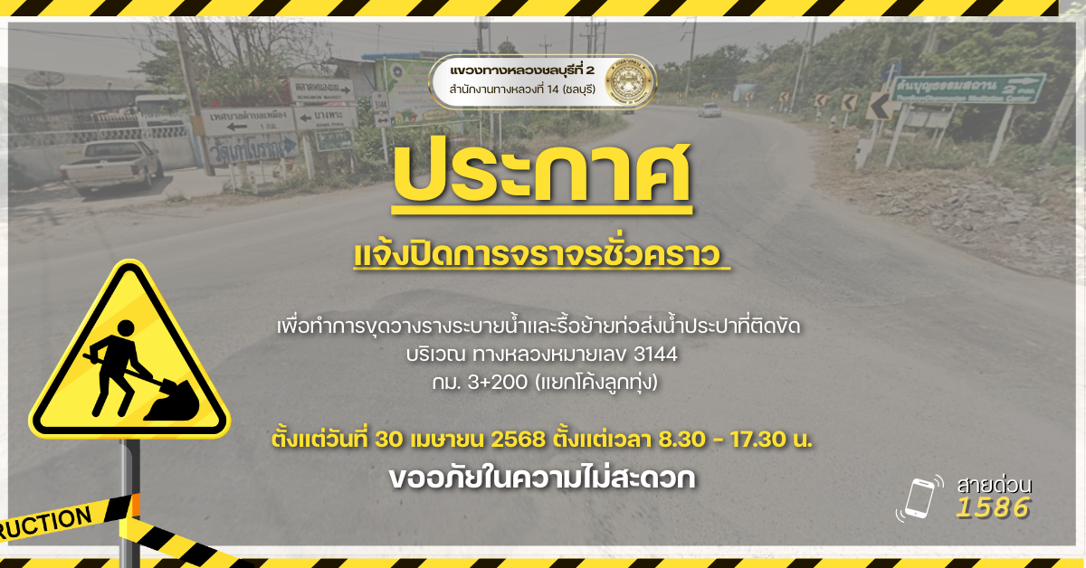 ประกาศ แจ้งปิดการจราจรชั่วคราว เพื่อทำการขุดวางรางระบายน้ำเเละรื้อย้ายท่อส่งน้ำประปาที่ติดขัด บริเวณ ทางหลวงหมายเลข 3144 กม. 3+200 (แยกโค้งลูกทุ่ง)