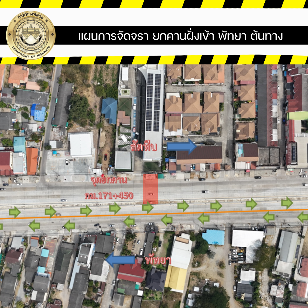 ประชาสัมพันธ์ แจ้งปิดการจราจรเพื่อทำงานก่อสร้างสะพานลอยคนเดินข้ามหรือทางลอด บริเวณทางหลวงหมายเลข 3 ตอนพัทยา - พลูตาหลวง ที่ กม.171+450