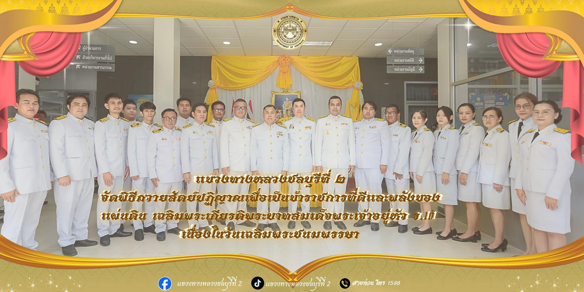 นายชาติพงษ์ รตโนภาส ผู้อำนวยการแขวงทางหลวงชลบุรีที่ 2 พร้อมด้วยข้าราชการ พนักงานราชการ ลูกจ้างประจำ และเจ้าหน้าที่ในสังกัดแขวงทางหลวงชลบุรีที่ 2 จัดพิธีถวายพระพรชัยมงคลและถวายสัตย์ปฏิญาณเพื่อเป็นข้าราชการที่ดีและพลังของแผ่นดิน เนื่องในโอกาสวันเฉลิมพระชนมพรรษา พระบาทสมเด็จพระปรเมนทรรามาธิบดีศรีสินทรมหาวชิราลงกรณ พระวชิรเกล้าเจ้าอยู่หัว 28 กรกฎาคม 2568 พร้อมทั้งลงนามถวายพระพร