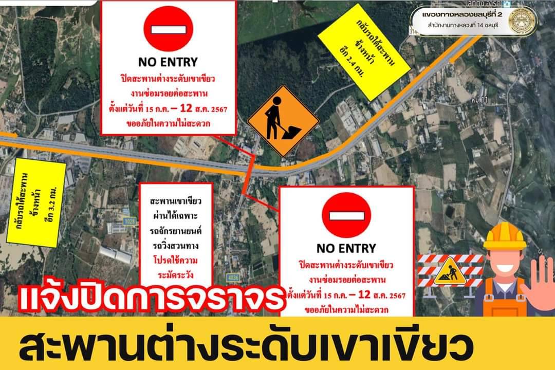 โดยโครงการก่อสร้าง จะทำการปิดสะพานต่างระดับเขาเขียว เพื่อซ่อมรอยต่อสะพาน ตั้งเเต่งวันที่ 15 กรกฎาคม 2567 - 12 สิงหาคม 2567