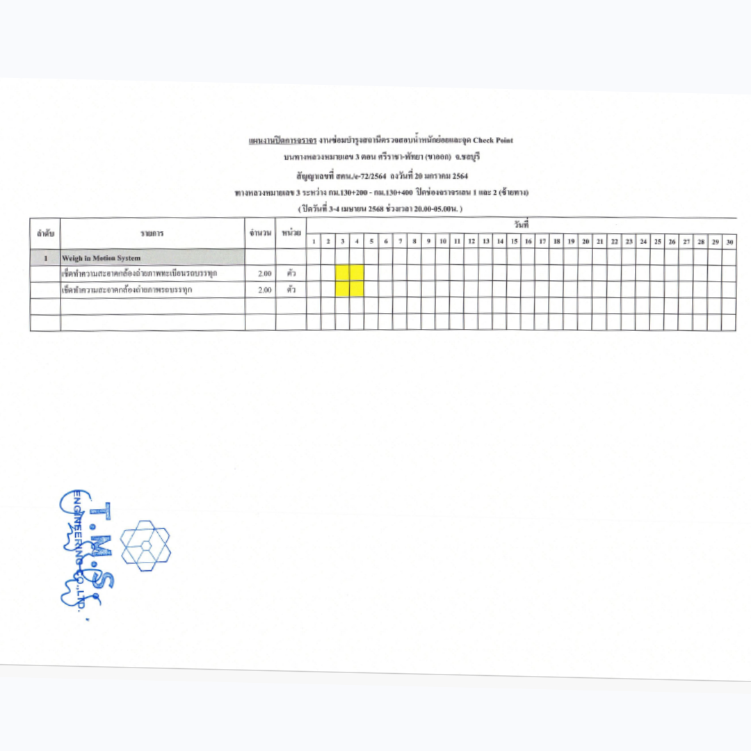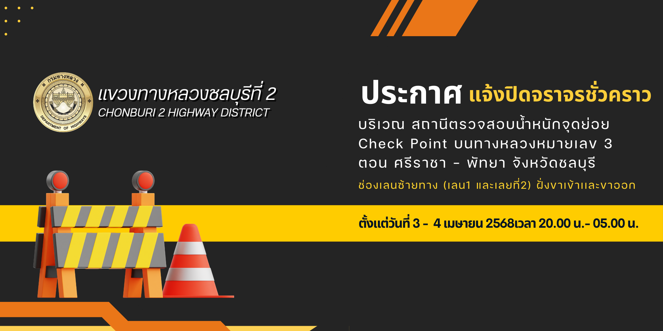 บริเวณ สถานีตรวจสอบน้ำหนักจุดย่อย Check Point บนทางหลวงหมายเลข 3 ตอน ศรีราชา - พัทยา จังหวัดชลบุรี เพื่อดำเนินการทำความสะอาดกล้องถ่ายภาพทะเบียนรถบรรทุก จึงขออนุญาตปิดการจราจรช่องเลนซ้ายทาง