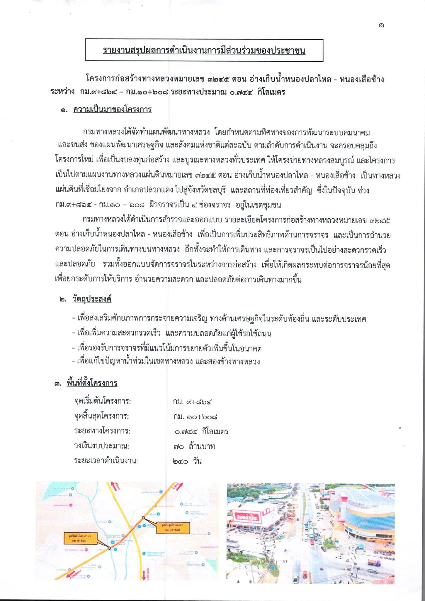 รายงานสรุปผลการดำเนินงานการมีส่วนร่วมของประชาชน โครงการก่อสร้างทางหลวงหมายเลข 3245 ตอน อ่างเก็บน้ำหนองปลาไหล - หนองเสือช้าง ระหว่าง กม.9+864 - กม.10+608 ระยะทางประมาณ 0.744 กิโลเมตร
