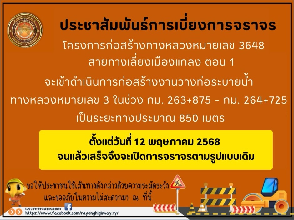 ทำการเบี่ยงการจราจรในทางหลวงหมายเลข ๓ ช่วงระหว่าง กม.๒๐๘+๔๐๐ – กม.๒๐๘+๔๕๐ ด้านซ้ายทาง เป็นระยะทางประมาณ ๕๐ เมตร ในวันจันทร์ ที่ ๑๓ พฤษภาคม ๒๕๖๗ เพื่อติดตั้งการก่อสร้างงานท่อระบายน้ำ