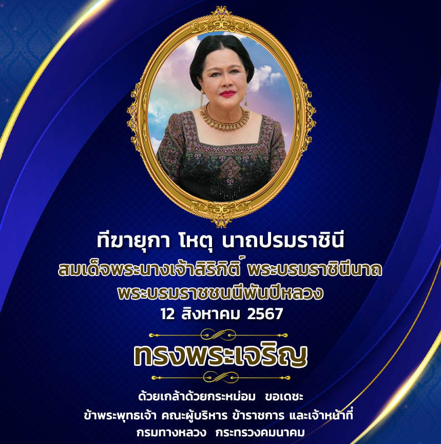 ทรงพระเจริญ สมเด็จพระนางเจ้าสิริกิติ์ พระบรมราชินีนาถ พระบรมราชชนนีพันปีหลวง เนื่องในโอกาสวันเฉลิมพระชนมพรรษา วันที่ ๑๒ สิงหาคม ๒๕๖๗ ด้วยเกล้าด้วยกระหม่อม ขอเดชะ ข้าพระพุทธเจ้า คณะผู้บริหาร ข้าราชการ และเจ้าหน้าที่ กรมทางหลวง กระทรวงคมนาคม